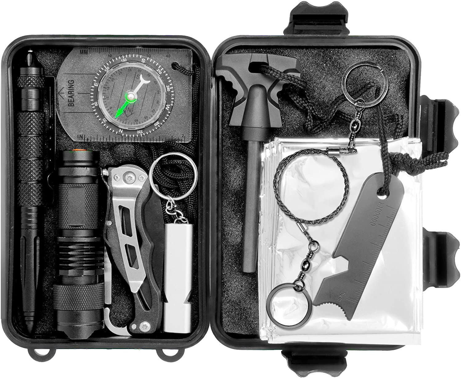 - One (1) 10-in-1 Emergency Tactical Gear Survival Kit Knife Blanket Compass Fire Starter Flashlight Saw Outdoor Camping Hiking Hunting Adventure Sports Equipment