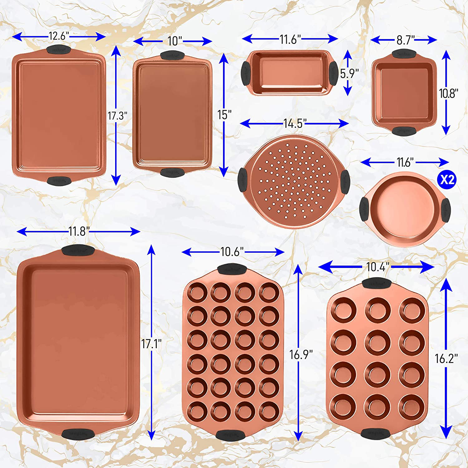Professional Home Kitchen Bakeware Set - Attractive, Stylish Non-Stick Metal Finish, Dishwasher Safe, PFOA, PFOS, PTFE Free Features: • Professional Home Kitchen Bakeware Set • Commercial Quality Metal Baking Tools • Durable & Reliable Cookie & Muffin Baking Pan Style • Attractive, Stylish Non-Stick Metal Finish • Dishwasher Safe • Long-lasting, Stain-resistant & Easy to Clean • Premium Food Grade Bakeware Construction • Space-saving Nestable Wide Tray Design • Not Recommended for Microwaves and All Appliances that Use Fire • Ideal for Baking Cake, Cookies, Bread, Brownies, Lasagna, etc. • Compatible with Kitchen Ovens, Countertop Convection Ovens, Toaster Ovens • Great for Meal Prep, Serving, Cooking, Sweet Treats, Pastry Baking • PFOA, PFOS, PTFE Free What’s In The Box: • (1) Baking Sheet • (1) Roasting Pan • (1) Round Pizza Pan • (1) Medium Cookie Sheet • (2) Round Cake Pans • (1) Square Cake Pan • (1) Loaf Pan • (1) Large Cookie Sheet • (1) 12 Cup Muffin Pan Technical Specifications: • Temperature Resistance: Up to 446° Fahrenheit (230° Celsius) • Construction Material: Carbon Steel • Metal Tray Thickness: 0.35-0.4MM • Baking Sheet Size (L x W x H): 13.8'' x 10.4'' x 1.2'' -inches • Round Pizza Pan Size (L x W x H): 12.8'' x 12.8'' x 0.6''-inches • Large Cookie Sheet Size (L x W x H): 16.9'' x 11.4'' x 0.8''-inches • Medium Cookie Sheet Size (L x W x H): 14.6'' x 10.2'' x 0.7'' -inches • Round Cake Pan Size (L x W x H): 9" x 9" x 1.5" -inches • Square Cake Pan Size (L x W x H): 9.1'' x 8.7'' x 2'' -inches • Loaf Pan Size (L x W x H): 9.8'' x 5.1'' x 2.6'' -inches • Roasting Pan Size (L x W x H): 13.8'' x 13.8'' x 0.8'' -inches • 12-Cup Muffin Pan Size (L x W x H): 13.8'' x 10.4'' x 1.2'' -inches • Sold as: 1 set • Weight: 8.56 lbs.