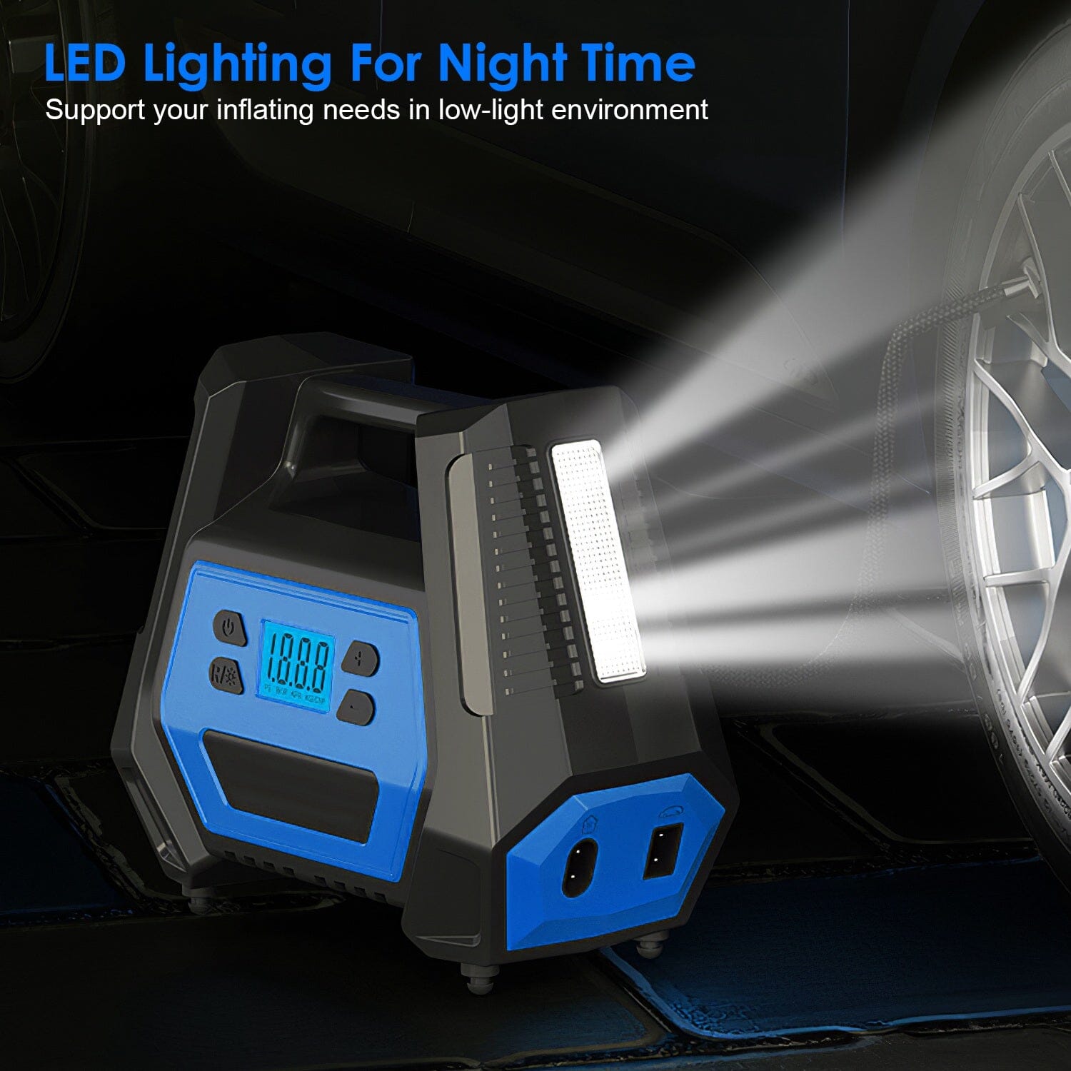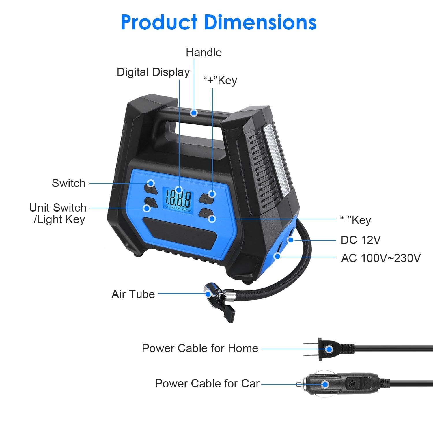 - LED Lighting for Night Use: Paired with the 292 cm long power cable for the car, 166 cm long power cable for home, and 62.5 cm air hose, both front and rear tires will be well taken care of with minimal effort. The tire pump features an LED lighting function to support your inflation needs in low-light conditions.