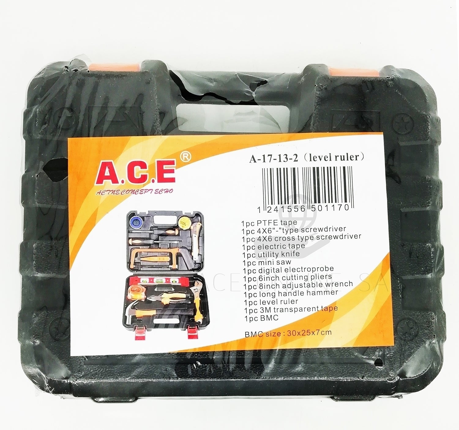 A toolbox containing a variety of tools such as pliers, screwdrivers, a measuring tape, and more. This set is primarily used in workshops and homes where it is essential.