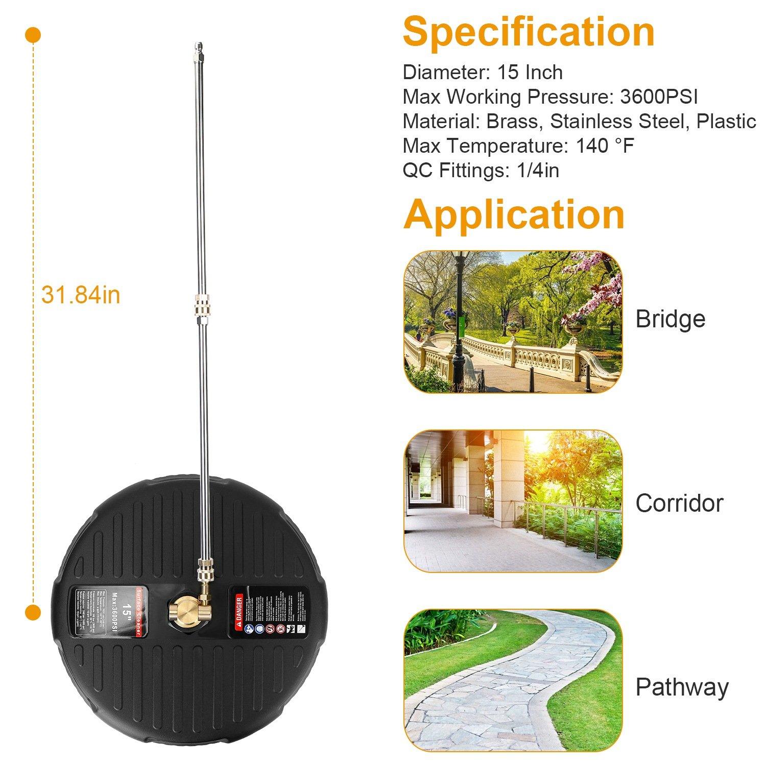 - Easy Connection: The surface cleaner easily attaches to a 1/4 inch quick-connect compatible wand, just like a spray nozzle. The package includes two 38 cm pressure washer poles along with one round surface cleaning tool.