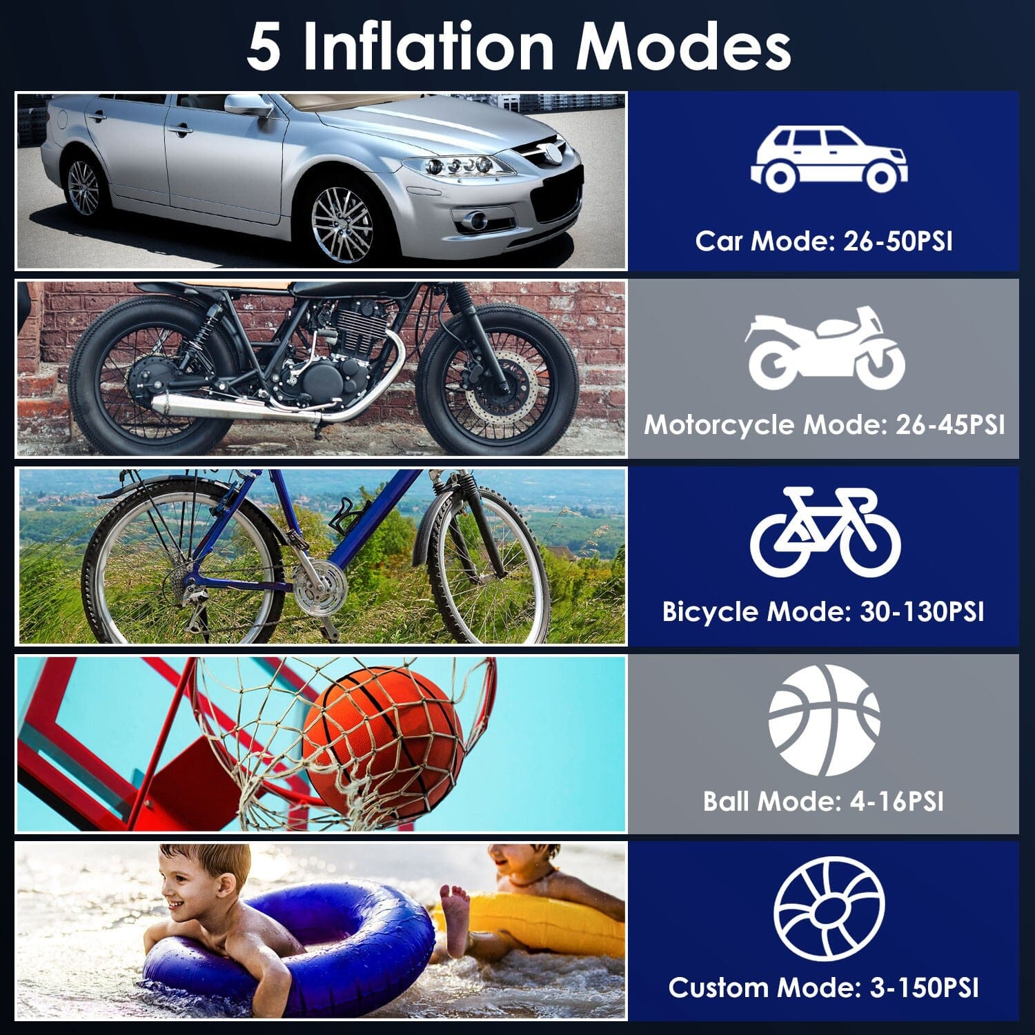 What many may not realize is that a tire pump can be life-saving. If you find yourself stranded during a snowstorm with a flat tire and are unable to call for assistance, this portable air compressor can inflate your tire and get you back on the road within minutes. This tire pump offers 5 inflation modes for cars, motorcycles, bicycles, balls, and customized use, adjustable from 3 to 150 PSI. It automatically shuts off once inflation is complete. The white light supports your inflation needs in low light conditions, while the red SOS flashing light is there to call for help. Additionally, it serves as a 5V/1A power bank thanks to its built-in 3 x 2000mAh rechargeable batteries. Compact and portable, it is the ultimate all-in-one solution for tire maintenance on the go.