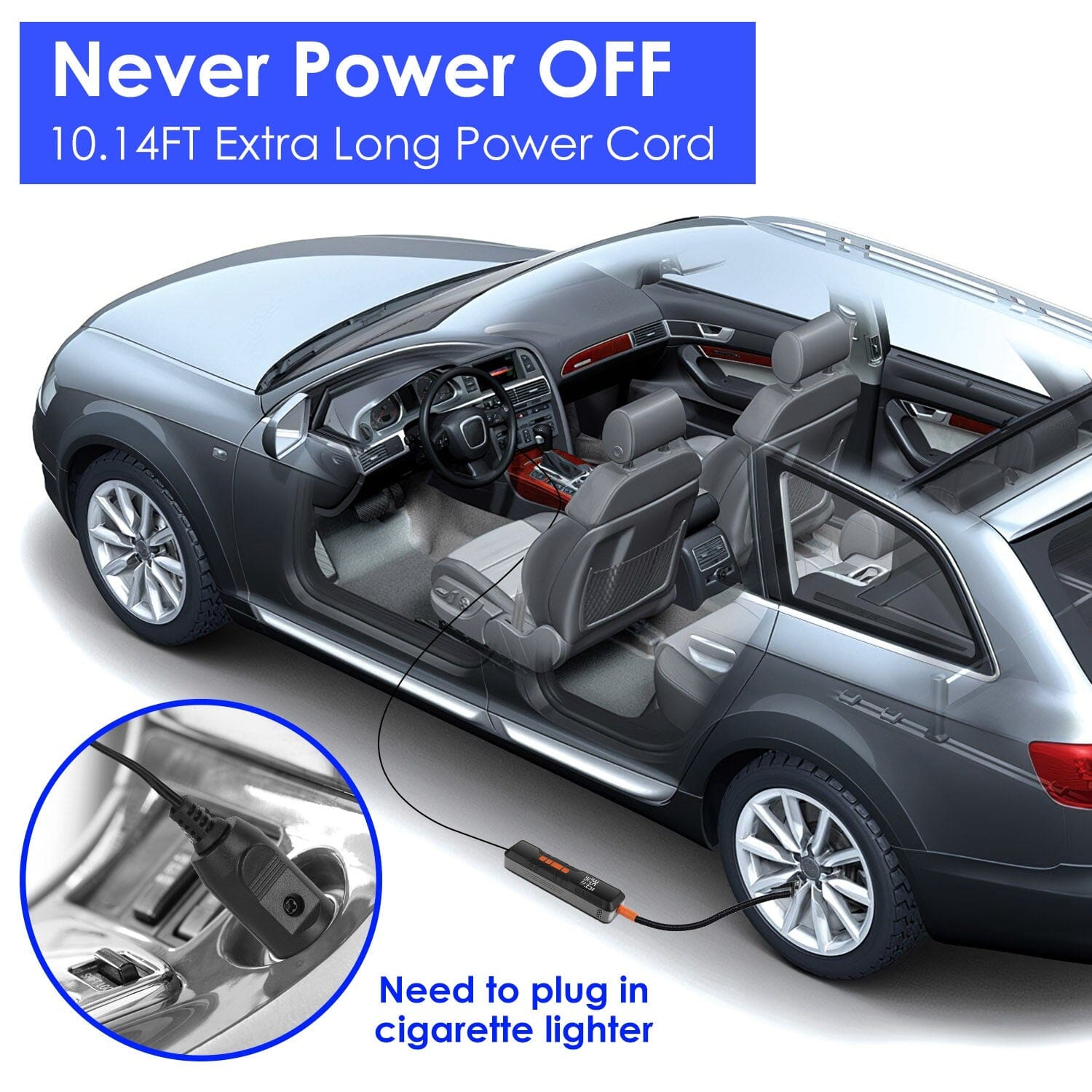 - Digital displays & LED lights: Equipped with a clear screen, you can effortlessly check the tire pressure and preset the desired pressure value. The automatic air pump also provides white light for your inflation needs in dim lighting and a red SOS light to signal for assistance.