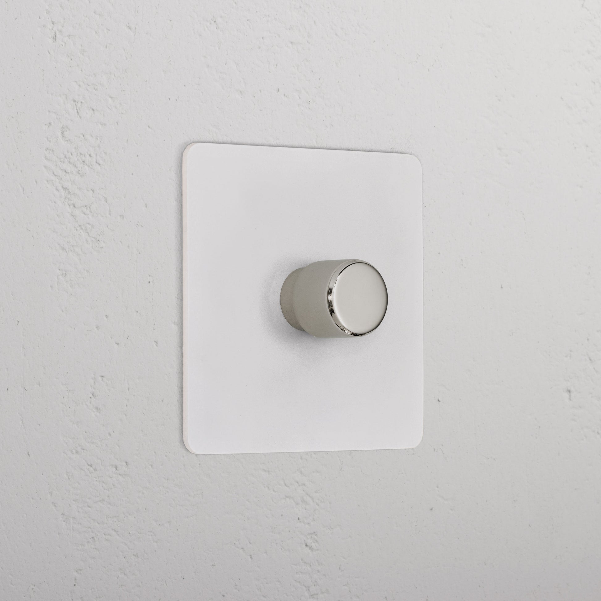 The subtle detail in solid brass on the switch is finished in Polished Nickel. Polished Nickel is our equivalent to chrome, featuring a slightly warmer tone, making it suitable for both warm and cool color schemes. Moreover, it is the only finish we offer that does not age—simply use a lint-free cloth to restore its shine.