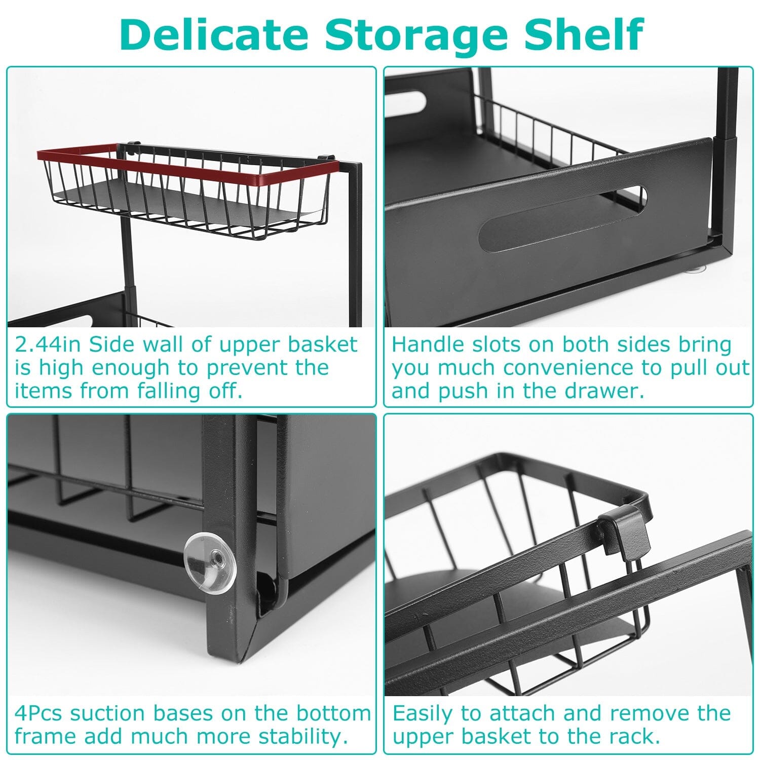 Our two-tier under-sink organizer meets your daily storage and organization needs effectively. This under-sink organizer is perfect for kitchens, cabinets, bathrooms, laundry rooms, pantries, offices, and various other locations. The top basket can be set up in seconds; the lower pull-out drawer adds flexibility and convenience for retrieving items in tight spaces. The smoothly hollow design ensures the basket is easy to clean without dirt getting trapped inside, and when paired with cushions, this shelf offers much greater stability for your spices. It’s simple to assemble with no tools required, allowing installation within minutes. Four suction cups at the bottom provide added stability.