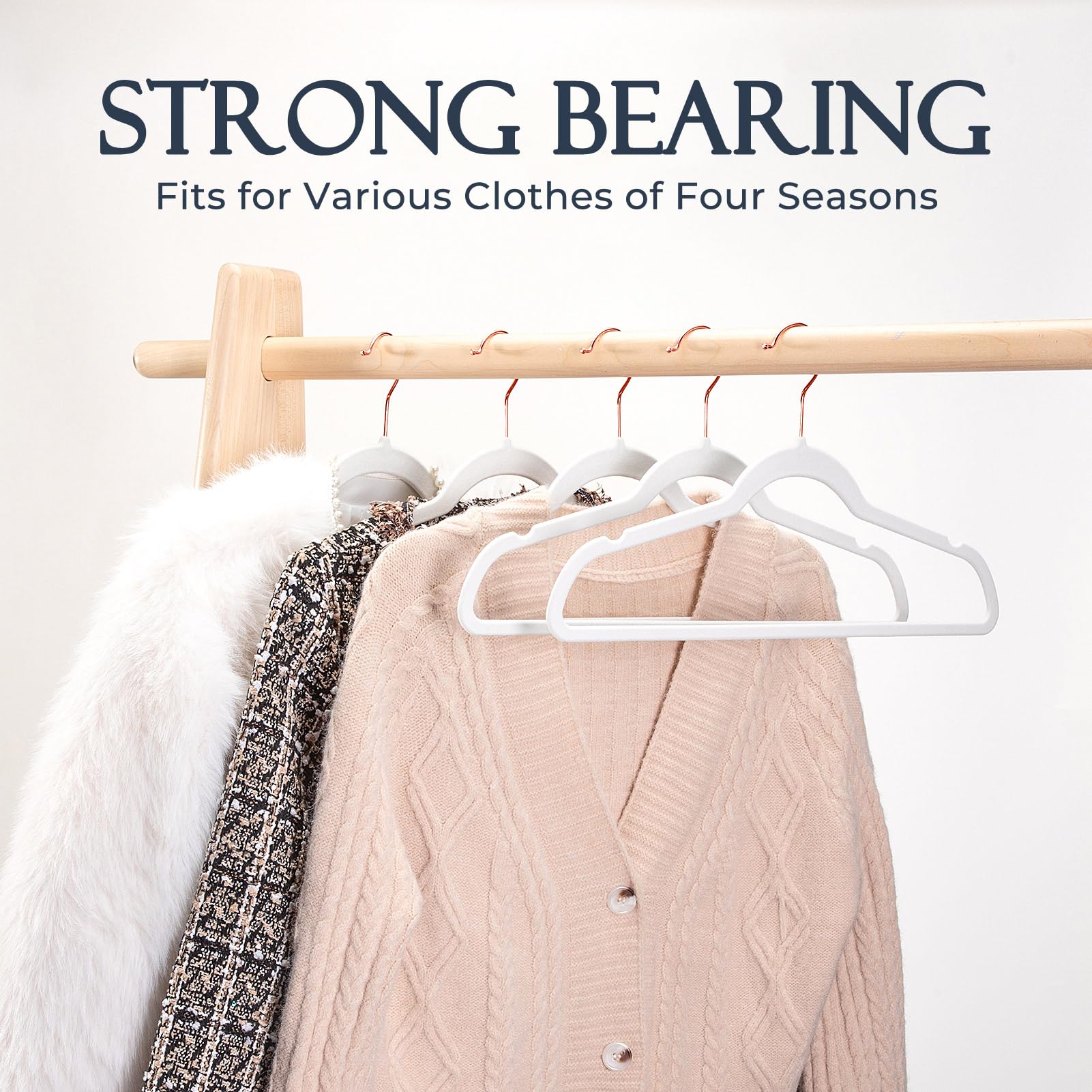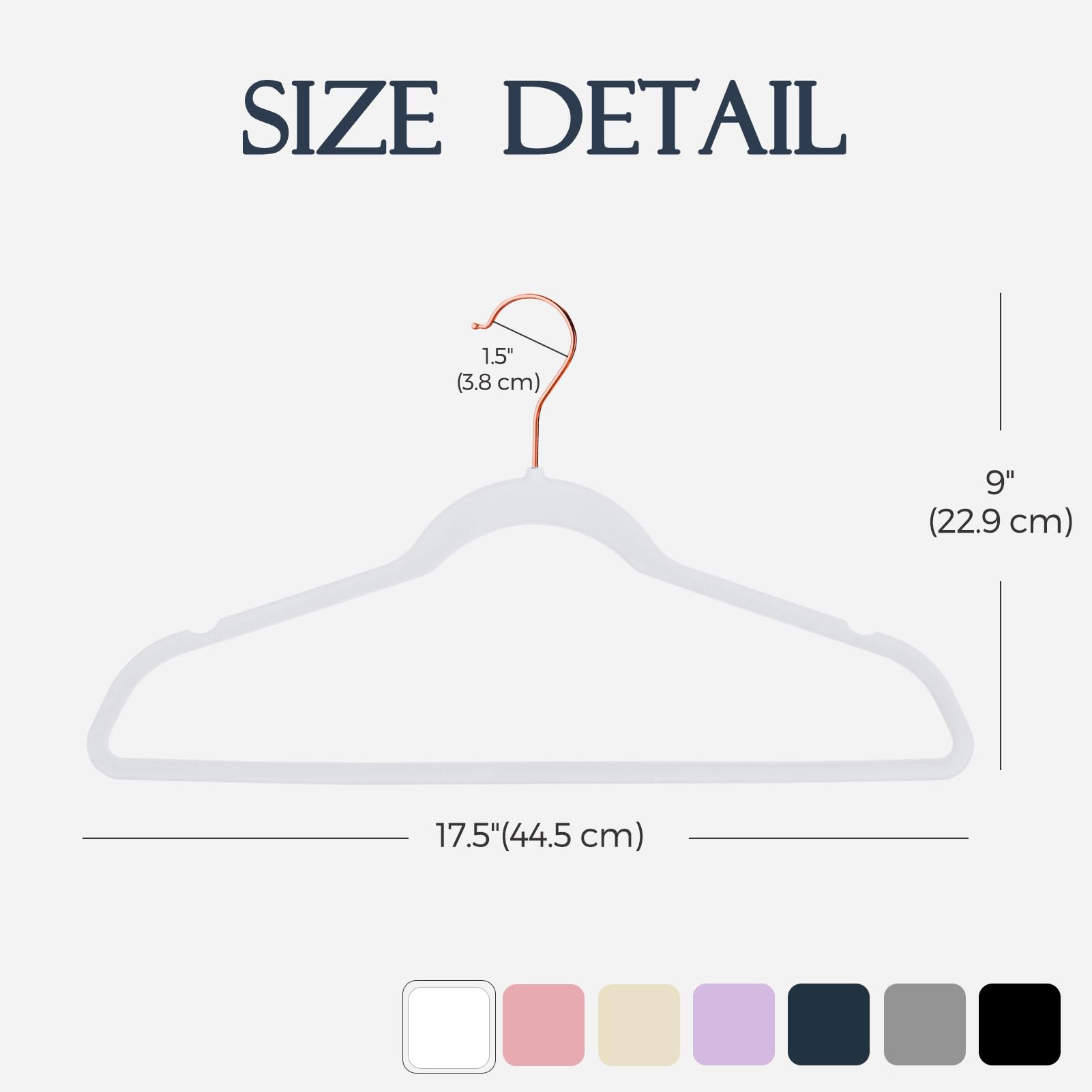 - 360° Rotating Metal Hook in Rose Gold or Galvanized Finish: The hangers come with a sturdy, 360-degree swivel hook, available in elegant rose gold or classic galvanized metal. This allows for easy sorting of clothes from any angle, providing convenience and a sophisticated look to your closet.
