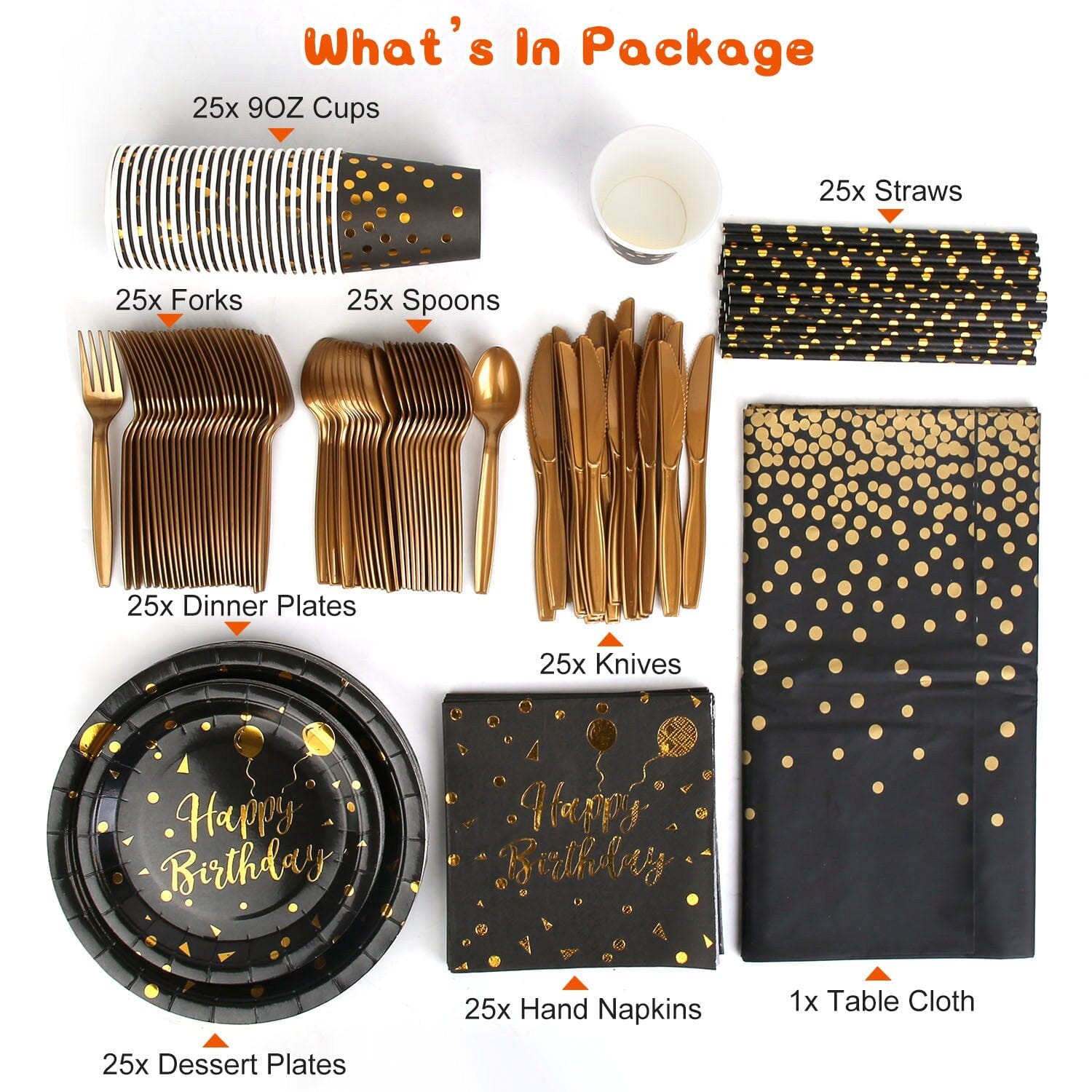 - Serves 25 Guests: Our birthday party tableware set includes 1 tablecloth for table protection, 25 dinner plates for vegetables, fruits, and meals, 25 dessert plates for cakes, cookies, and pies, 25 9 oz cups with straws for juice and wine, 25 forks, spoons, and knives for cutting and eating, along with 25 napkins for wiping mouths and hands after the meal. A total of 201 pieces to cater to 25 guests at once, fulfilling all the needs of the birthday feast.