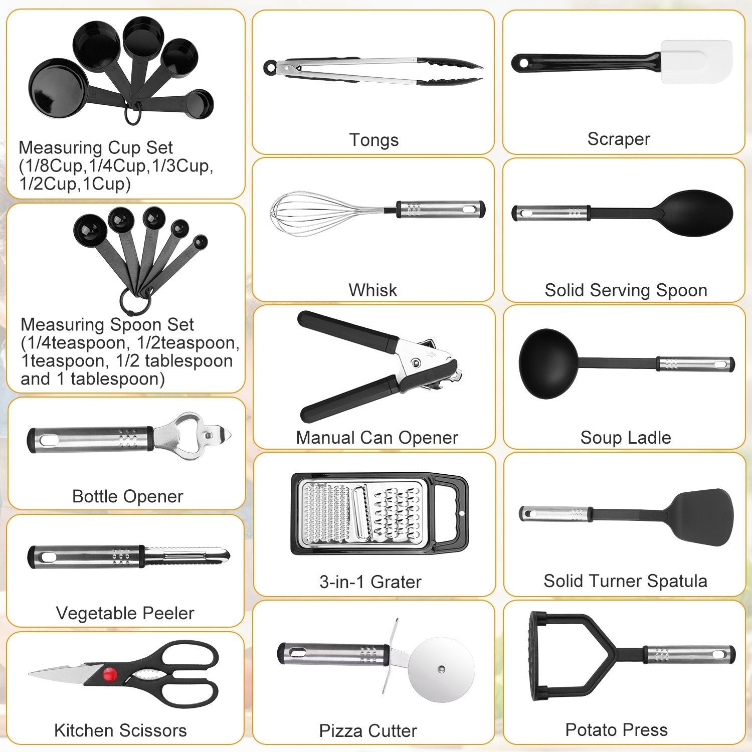 - Kitchen enhancement: It's specifically designed to assist you with all your food prep tasks, including whisking, peeling, chopping, stirring, mixing, basting, baking, grilling, frying, and serving the ideal dish! Measuring cups and spoons labeled with sizes provide great convenience when baking or enjoying coffee and tea.