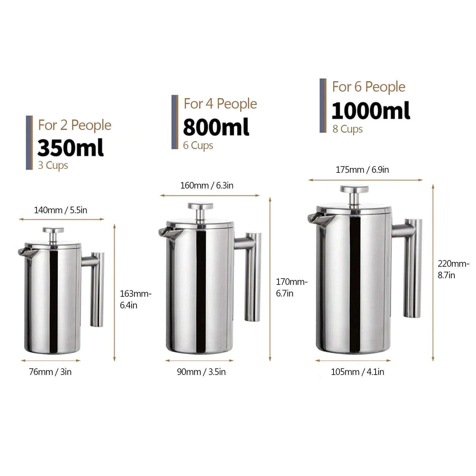 Rynx | 350ml/800ml/1000ml French Press Coffee Maker - Stainless Steel Double-Walled Insulated Coffee Pot