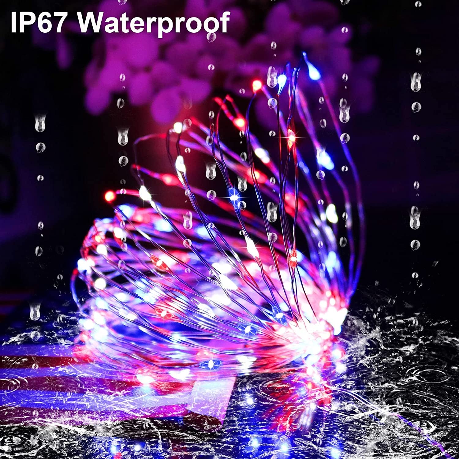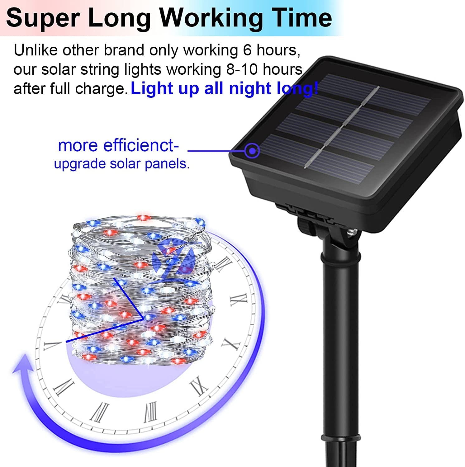 July 4th patriotic decorations for outdoor home lighting - Red, white, and blue solar lights, 2 packs of 100 LED each, 33 feet