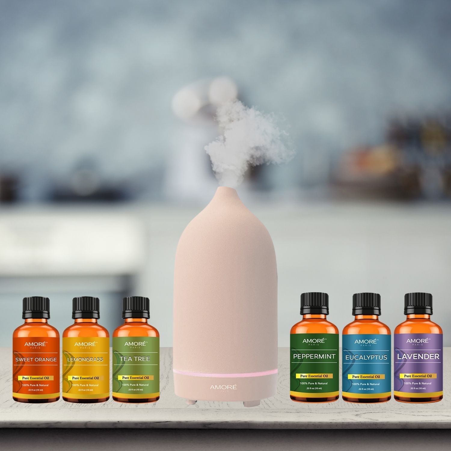 A stunning, matte ceramic finish is distinctive, elegant, and seamlessly complements any space. Handcrafted with care, this exquisite ceramic diffuser is made of top-quality porcelain. It comes with a set of six essential oils.