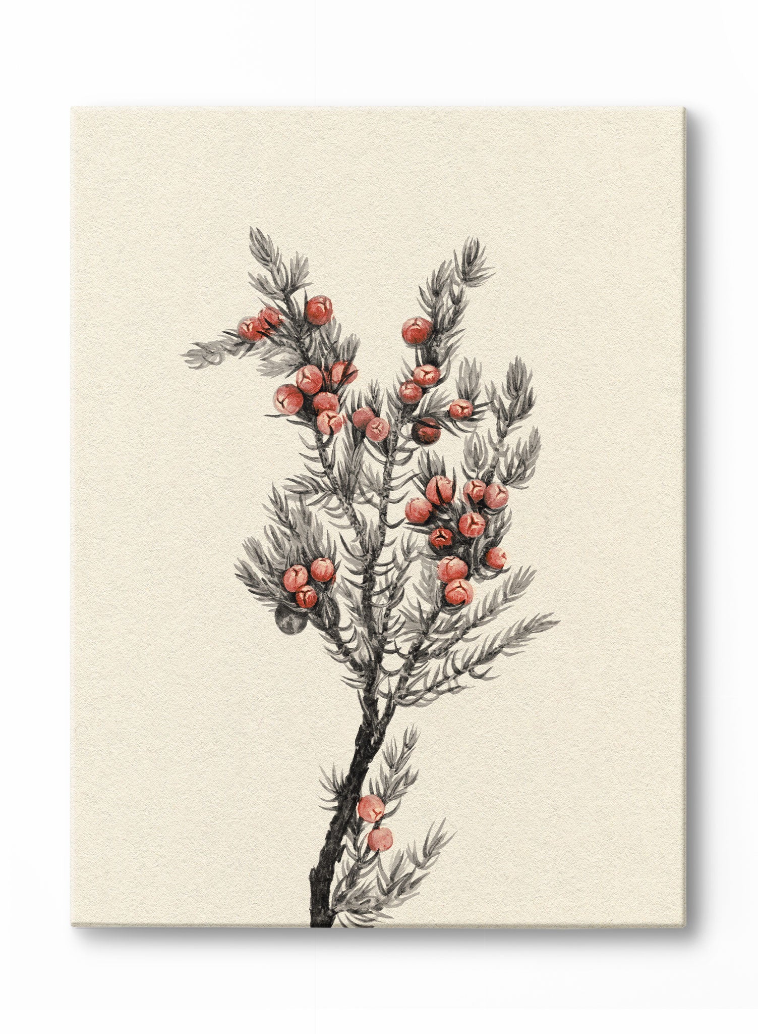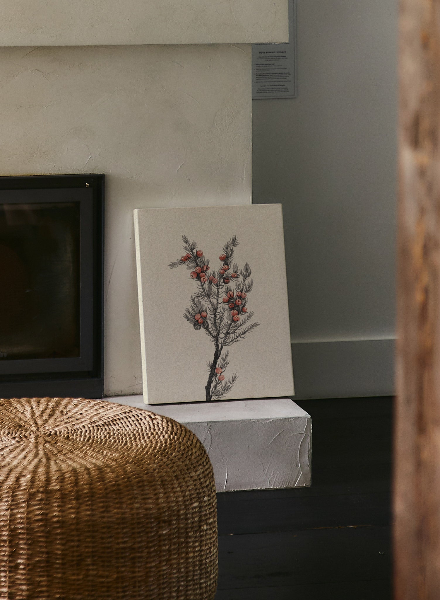 Snuggle up and enjoy 'A Winter Tale': a beautiful depiction of a dark evergreen branch, adorned with brown acorns set against a beige backdrop. This inviting canvas will brighten up your wall throughout the winter season!