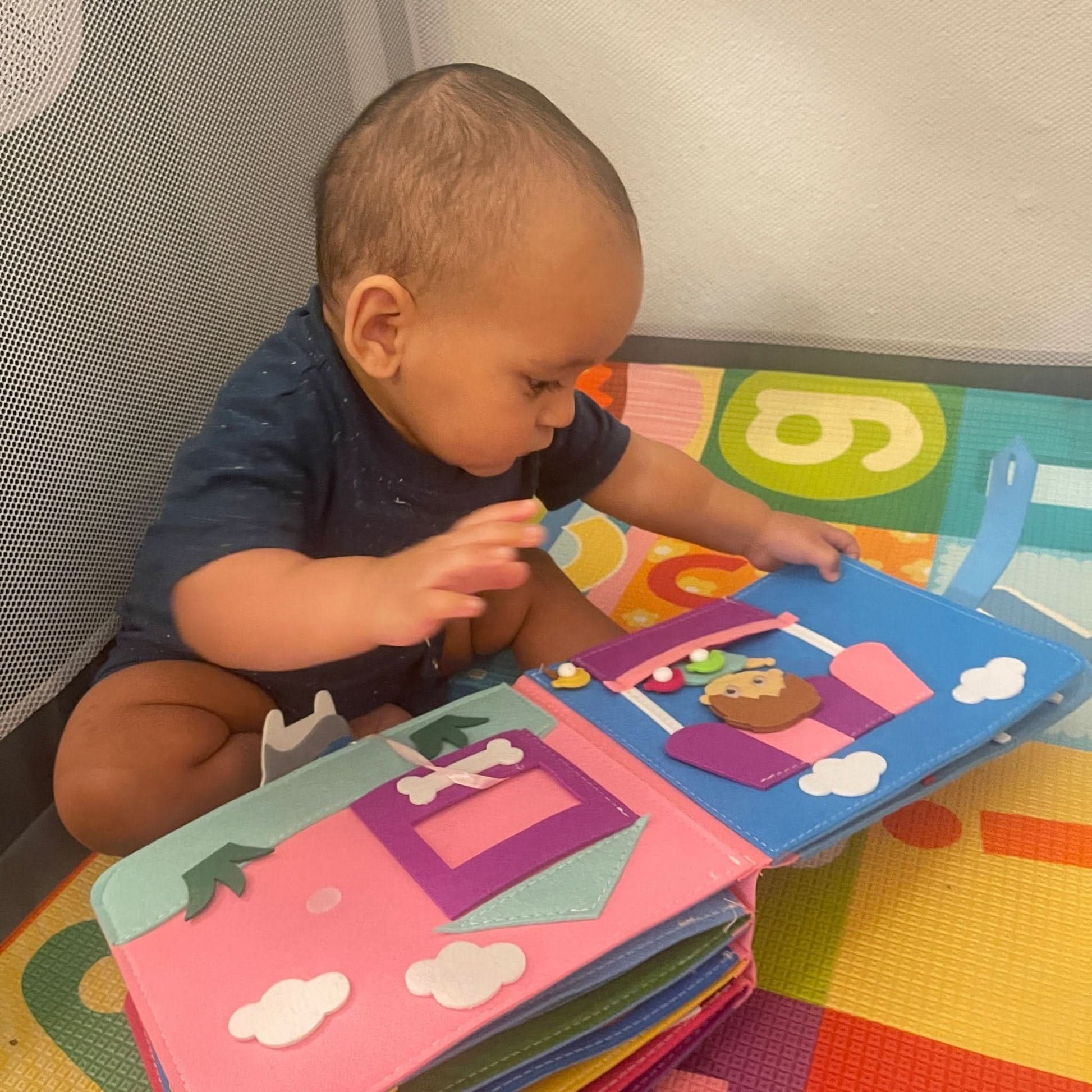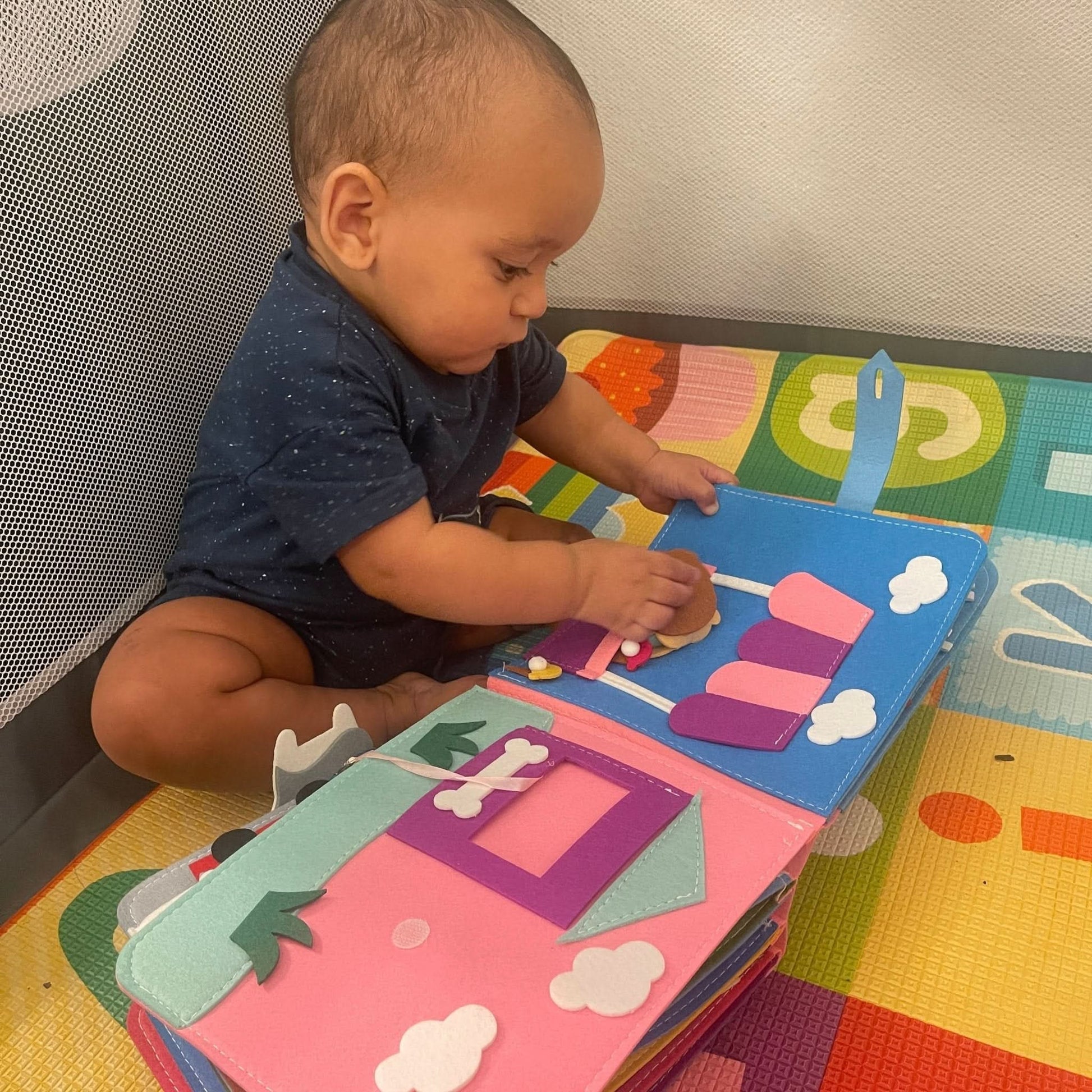 This interactive fabric book is designed to encourage sensory exploration, fine motor skill development, and early learning experiences for toddlers.