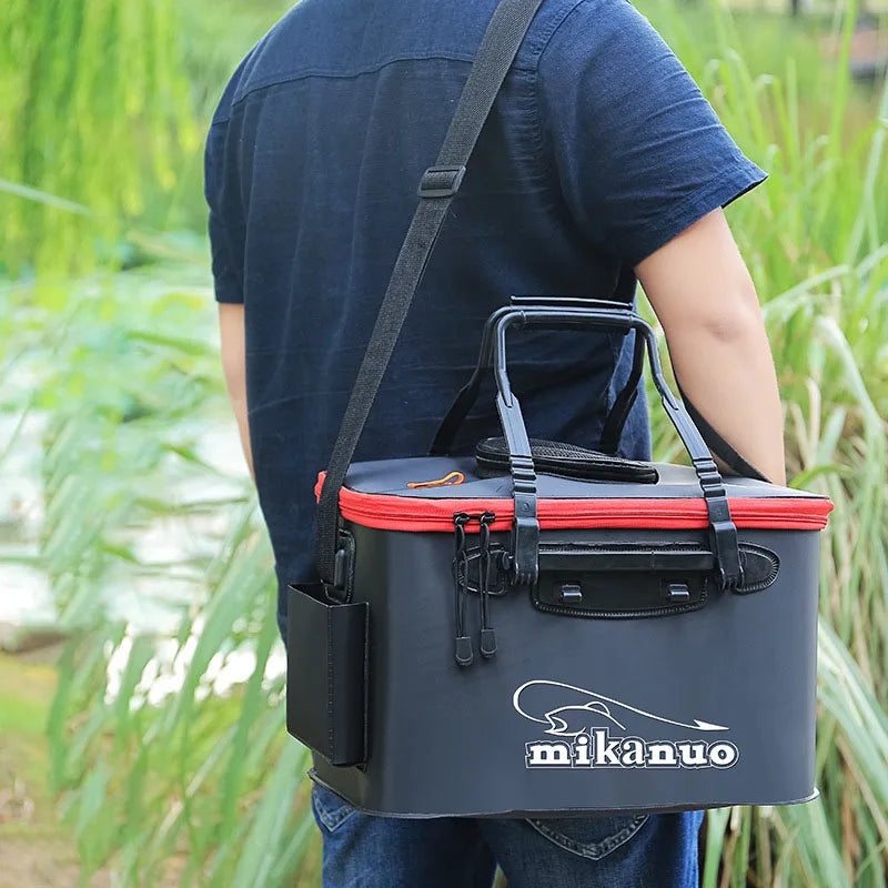 A portable and foldable fishing tank, made from waterproof and durable materials. Perfect for fishing and car cleaning. It can hold water for camping and hiking, and is also suitable for live bait. It includes a side pocket for an oxygen pump, allowing your fish to breathe more easily, along with a mesh lid that simplifies the process of putting fish in and taking them out. Cleans easily when used outdoors; just rinse it with water. It features an adjustable strap. This makes for a wonderful gift for your partner or anyone who enjoys fishing.