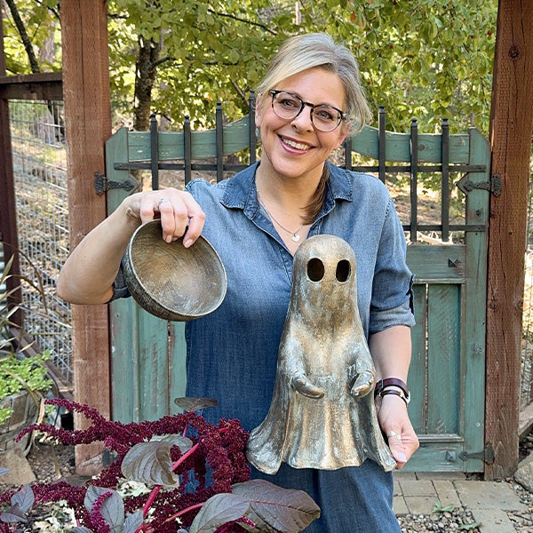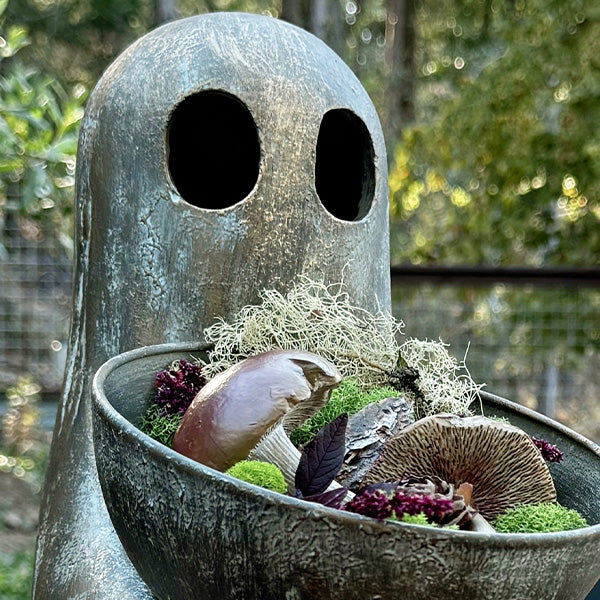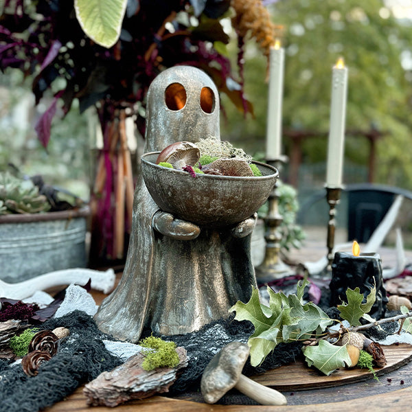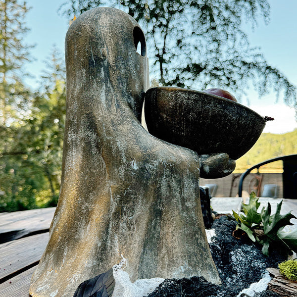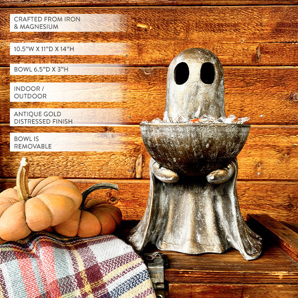 Enhance your Halloween ambiance with this vintage-inspired standing ghost in a stunning aged gold finish. This stylish yet eerie decoration showcases a ghost that comes with a detachable bowl – ideal for creating an inviting atmosphere at your upcoming Halloween celebrations or for adding a seasonal flair to your home. Its antique gold appearance lends a nostalgic charm, infusing any space with a fun and festive vibe.