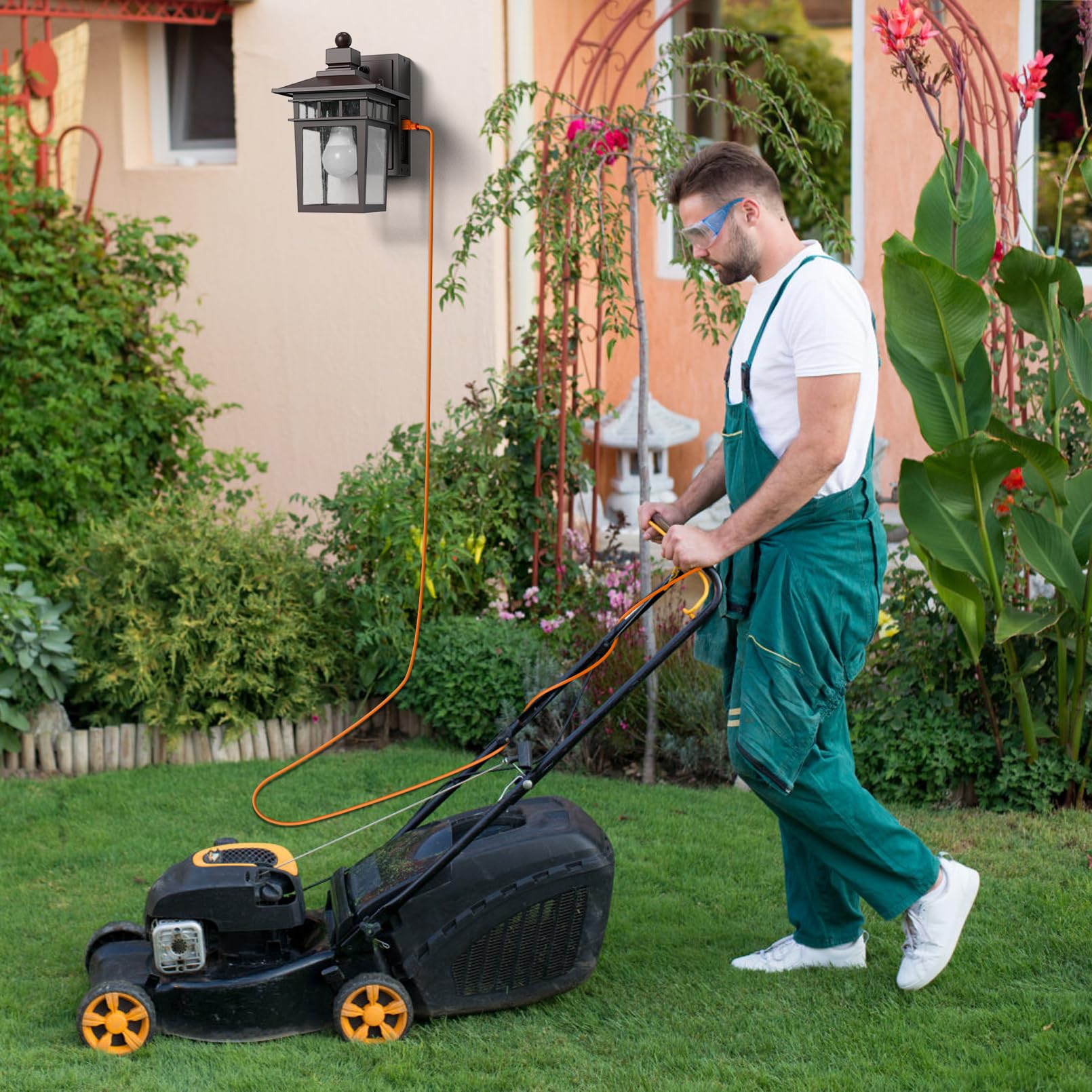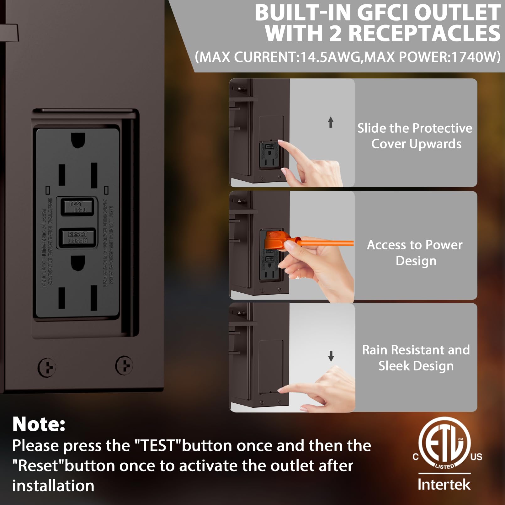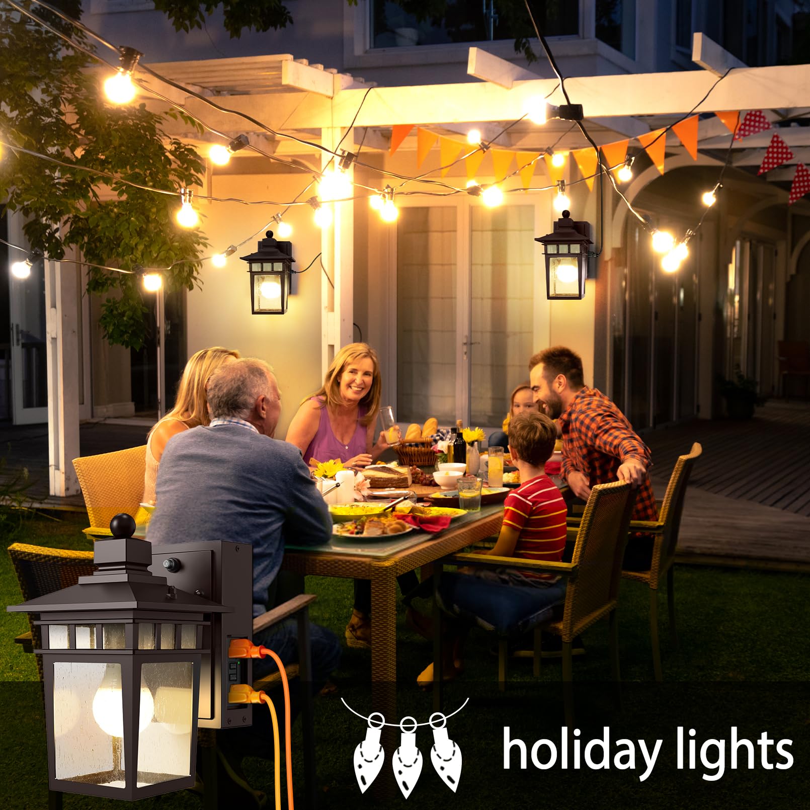 - **Built-in GFCI Outlet**: This outdoor light is equipped with a tamper-resistant design and includes a double GFCI outlet, ensuring a safe power supply for your 2-pronged and 3-pronged devices. It's perfect for outdoor decorations and equipment with a maximum current capacity of 15A.