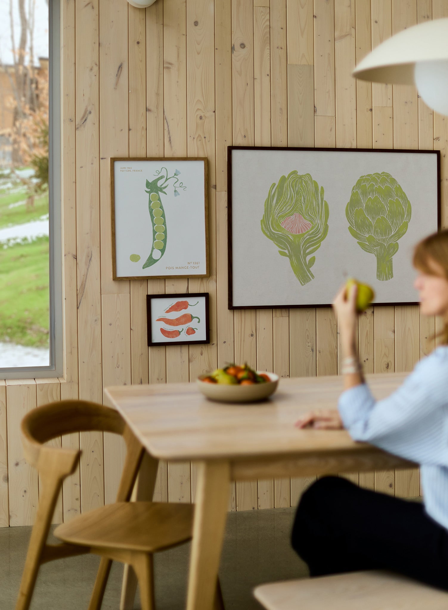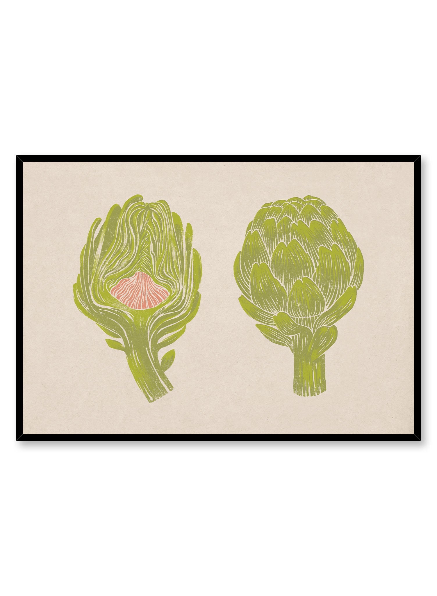 This print celebrates the inherent grace of artichokes with two striking representations – one whole and one halved, revealing its delicate layers and tender pink heart. The soft white lines accentuate the sculptural quality of the vegetable, imparting a hand-etched, nostalgic touch.