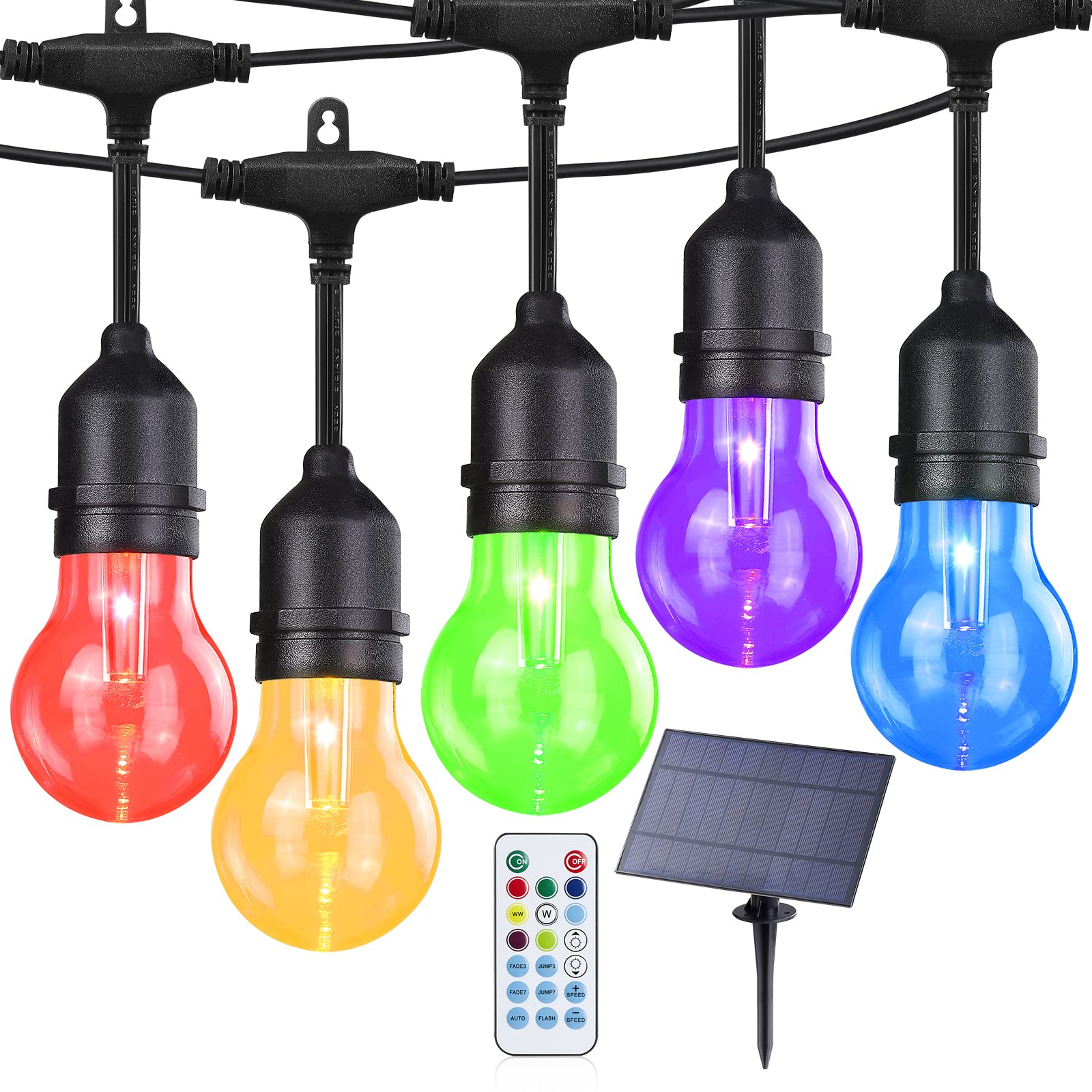 Rynx | Auroraworld Outdoor Light Strings RGB, 48Ft Dimmable Patio Light Strings with Shatterproof Edison Bulbs, Remote Control, Commercial Solar Light Strings for Café, Patio, Garden, Party