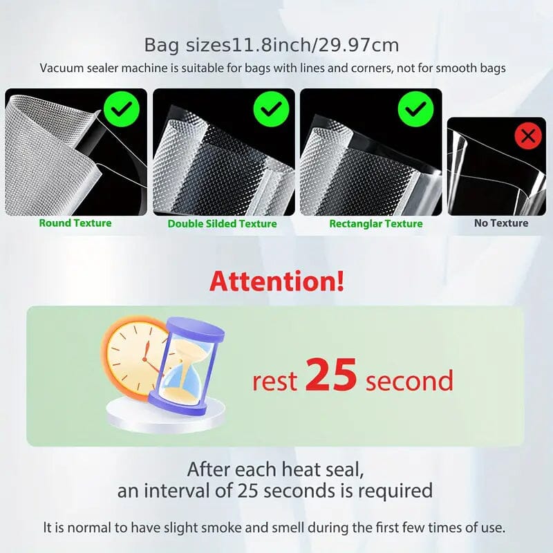 This set of 15 sealing bags along with an automatic vacuum sealer makes storing and preserving food both simple and efficient. Featuring an automatic function, it quickly seals food in airtight bags, prolonging its shelf life. The set includes 15 sealing bags, allowing you to stock up while saving both time and money.