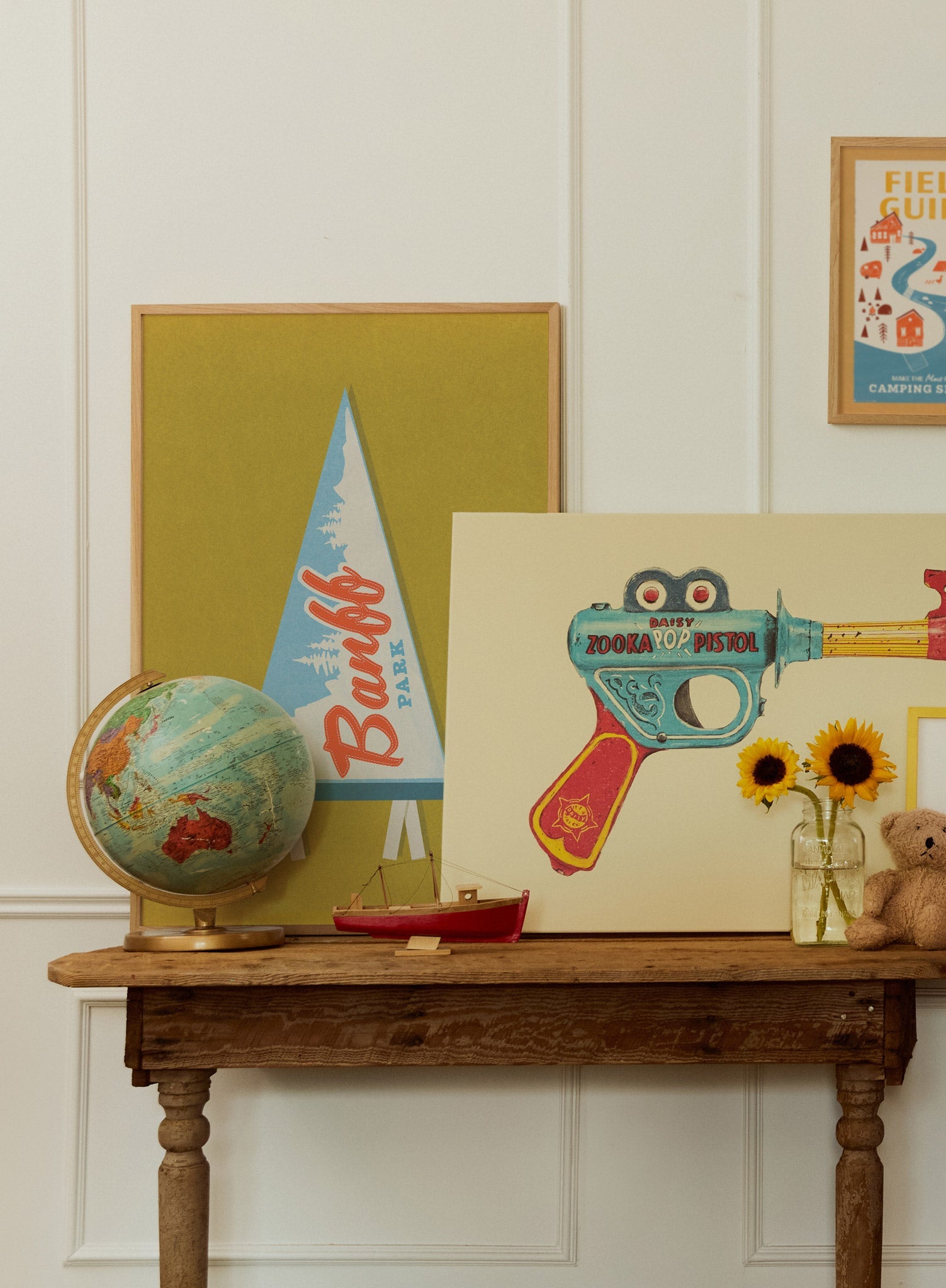 This vibrant art print features a banner for Banff Park, crafted in a nostalgic style with bright colors. The shades of blue and yellow evoke the stunning beauty of this renowned national park, making it a perfect addition to any travel-themed room.