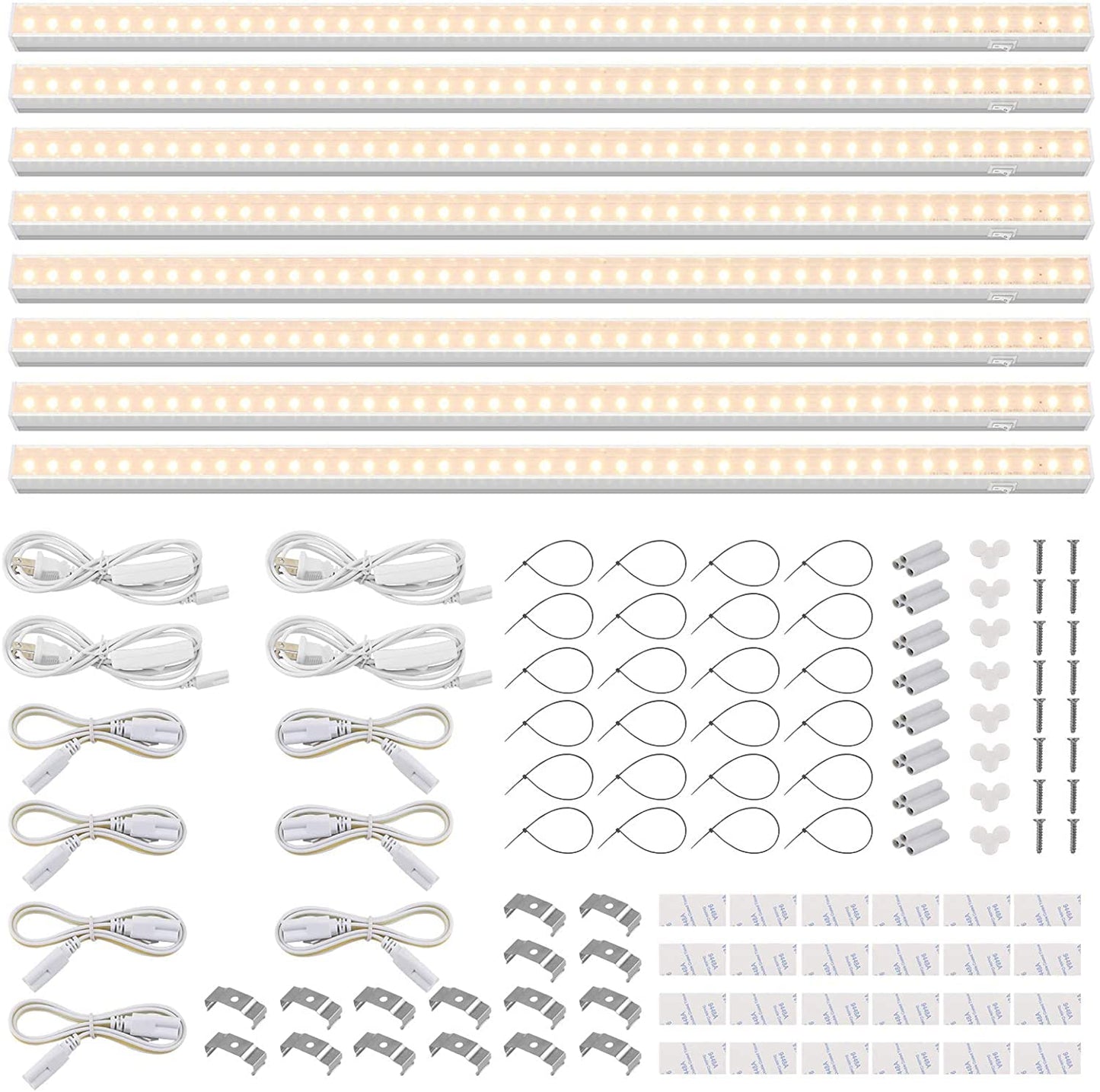 - **Comprehensive Package:** This set includes 8 Barrina T5 grow lights, 4 power cables with on/off switches, 7 connecting cables (20 inches), 8 small connectors, 16 installation clips, 24 double-sided tapes, and 24 attachment straps, providing you with everything necessary for a complete setup.