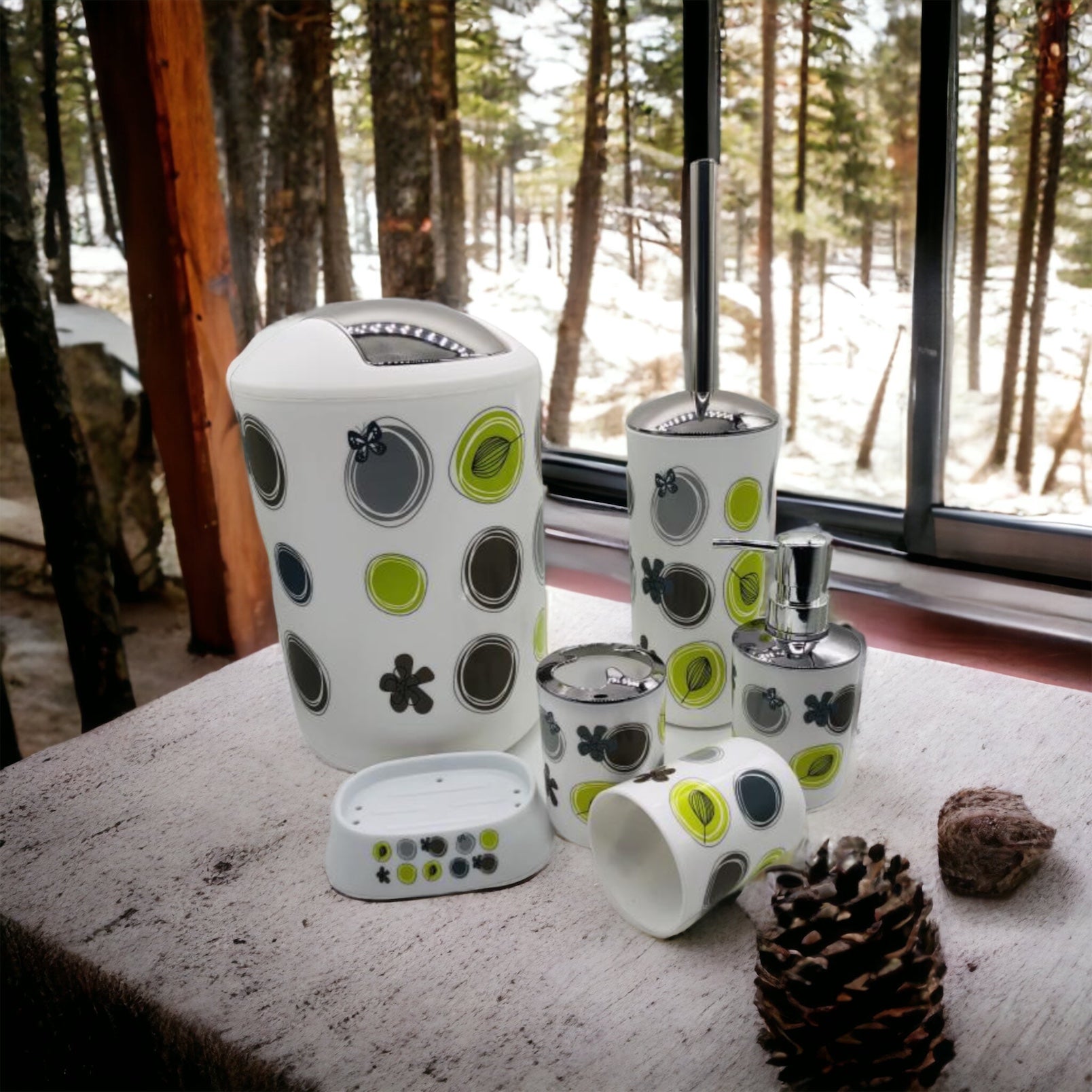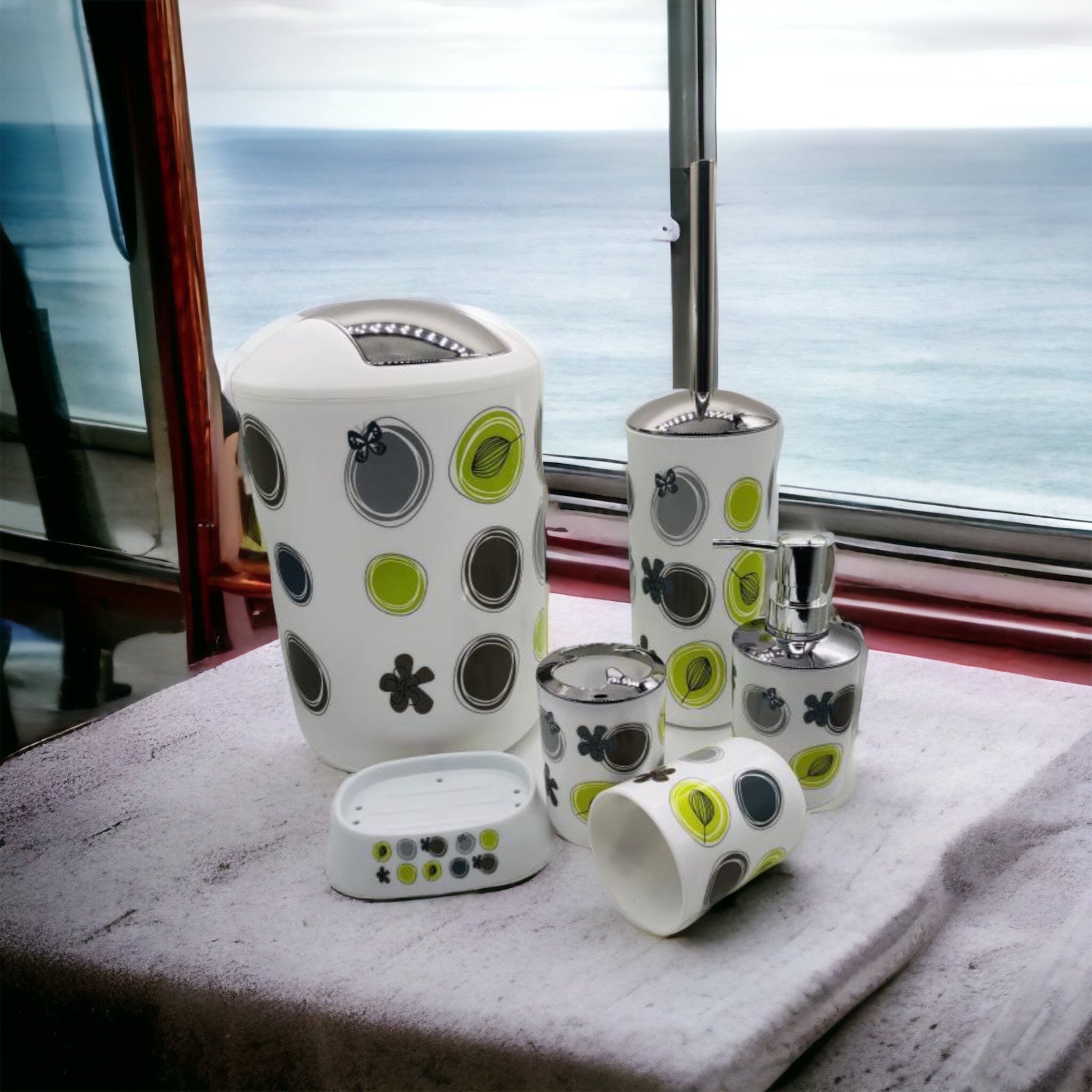 Complete set of bathroom accessories: toothbrush holder, cup, soap dispenser, soap dish, toilet brush & holder, and trash can.