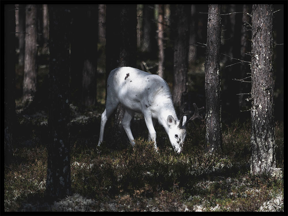 This captivating photo poster features a stunning albino reindeer in its natural habitat. With its remarkable white fur and magnificent antlers, it is a true masterpiece of nature.