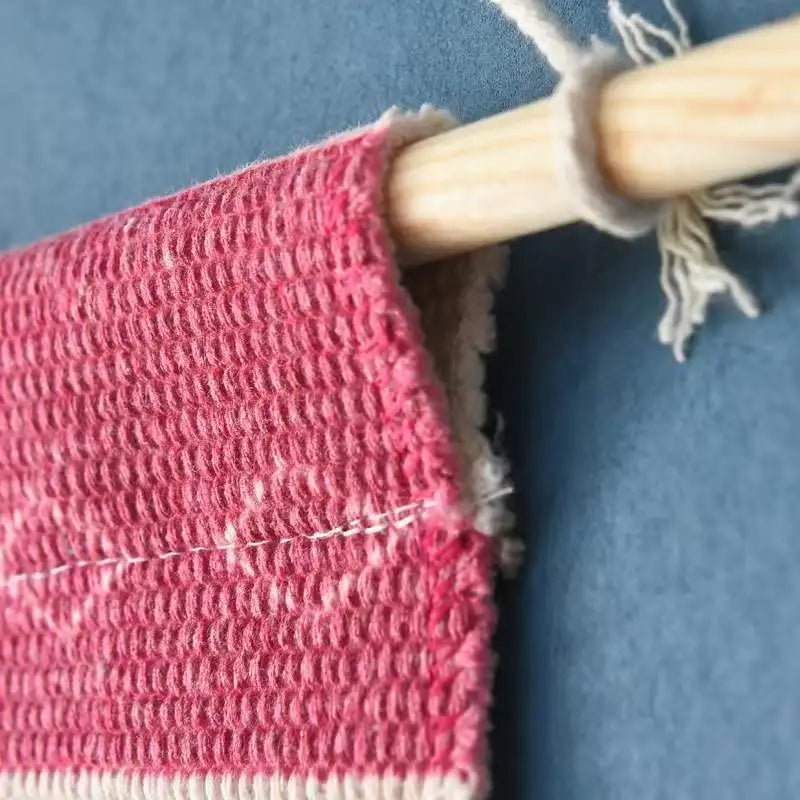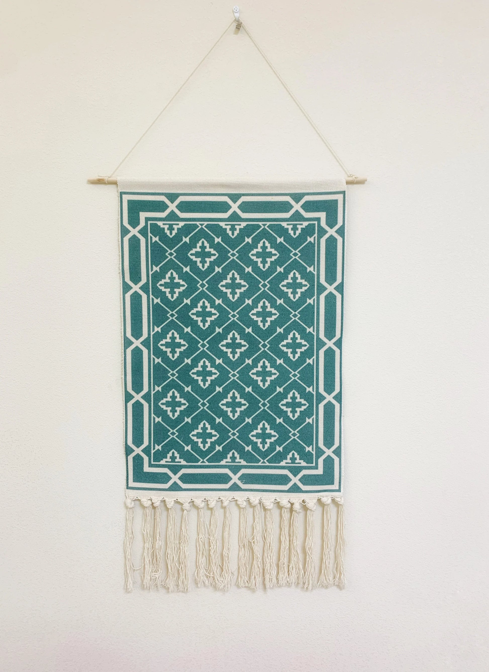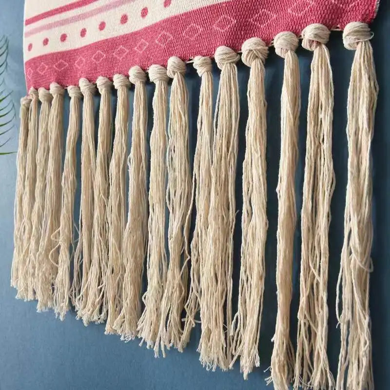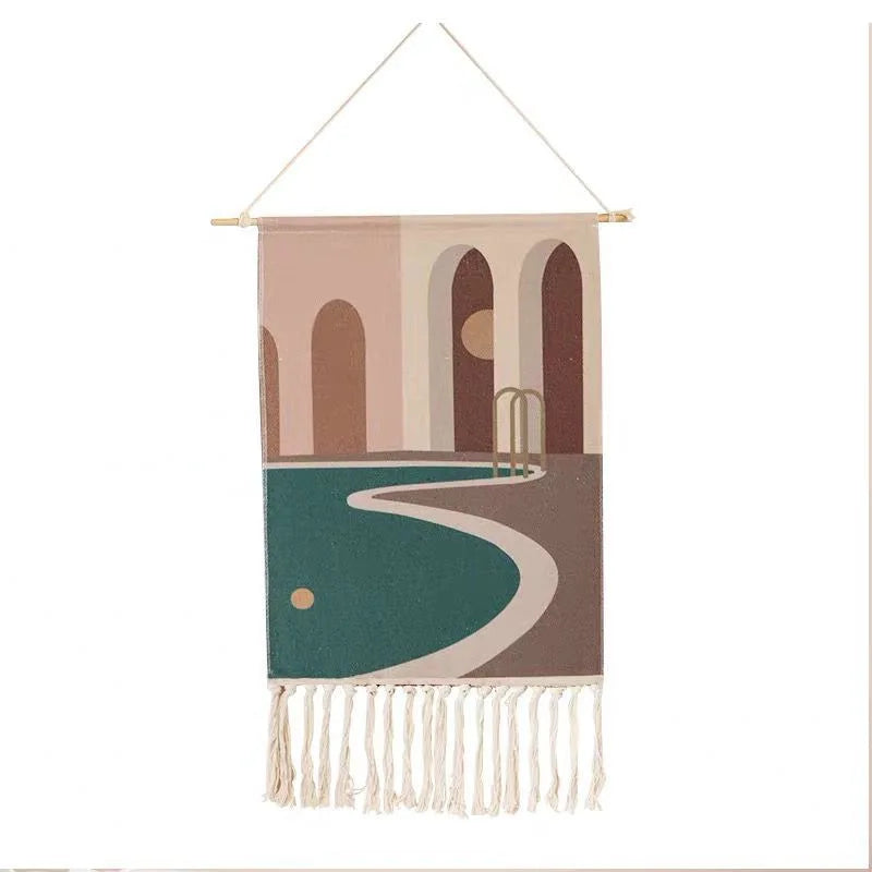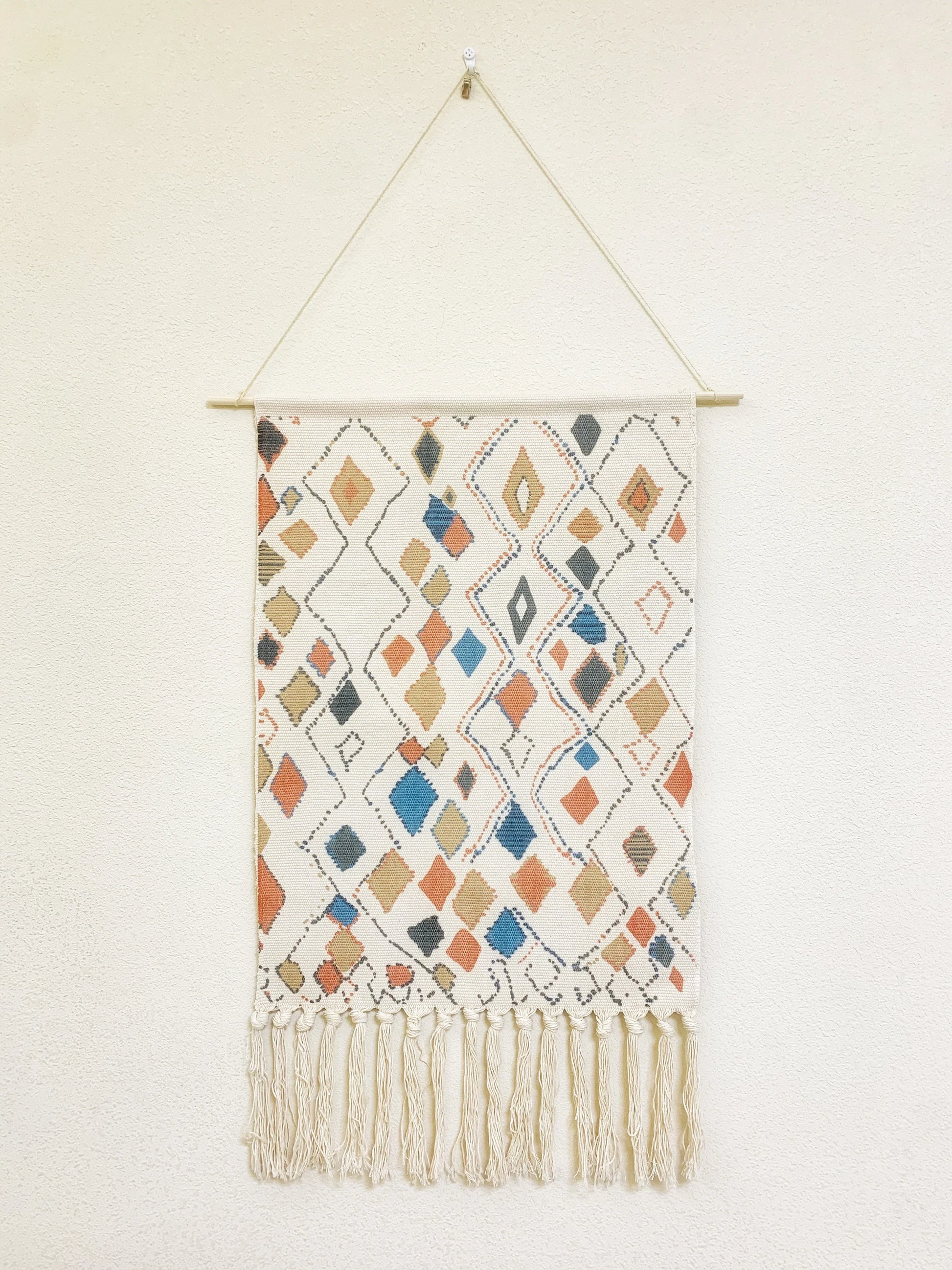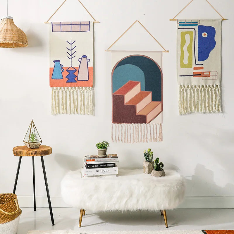 Infuse your living space with a contemporary Boho vibe by incorporating this trio of geometric wall art. Each item showcases abstract representations of mountainous scenery in earthy shades and gentle blues, capturing the essence of nature with minimalist forms and patterns. The textured textile and fringe details elevate the natural aesthetic, making this collection ideal for Boho, organic, or creatively inspired decors.