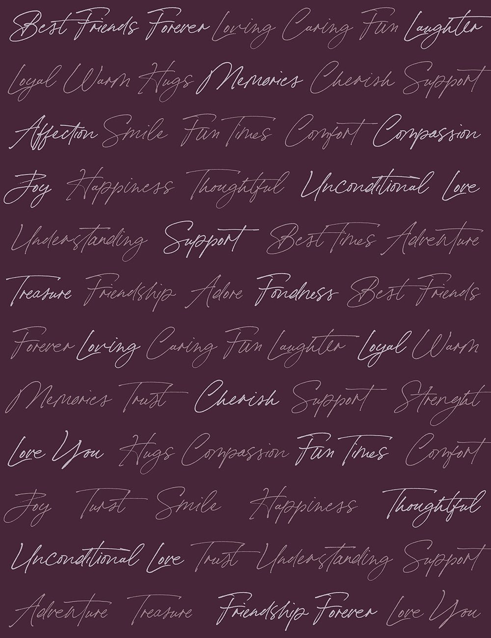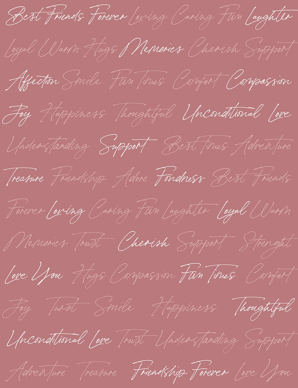 Highlighted Words: Best Friends Forever Love Caring Fun Laughter Loyal Warm Hugs Memories Cherish Support Affection Smile Fun Times Comfort Compassion Joy Happiness Thoughtful Unconditional Love Understanding Treasure Adore Affection Trust Love You Strength Adventure