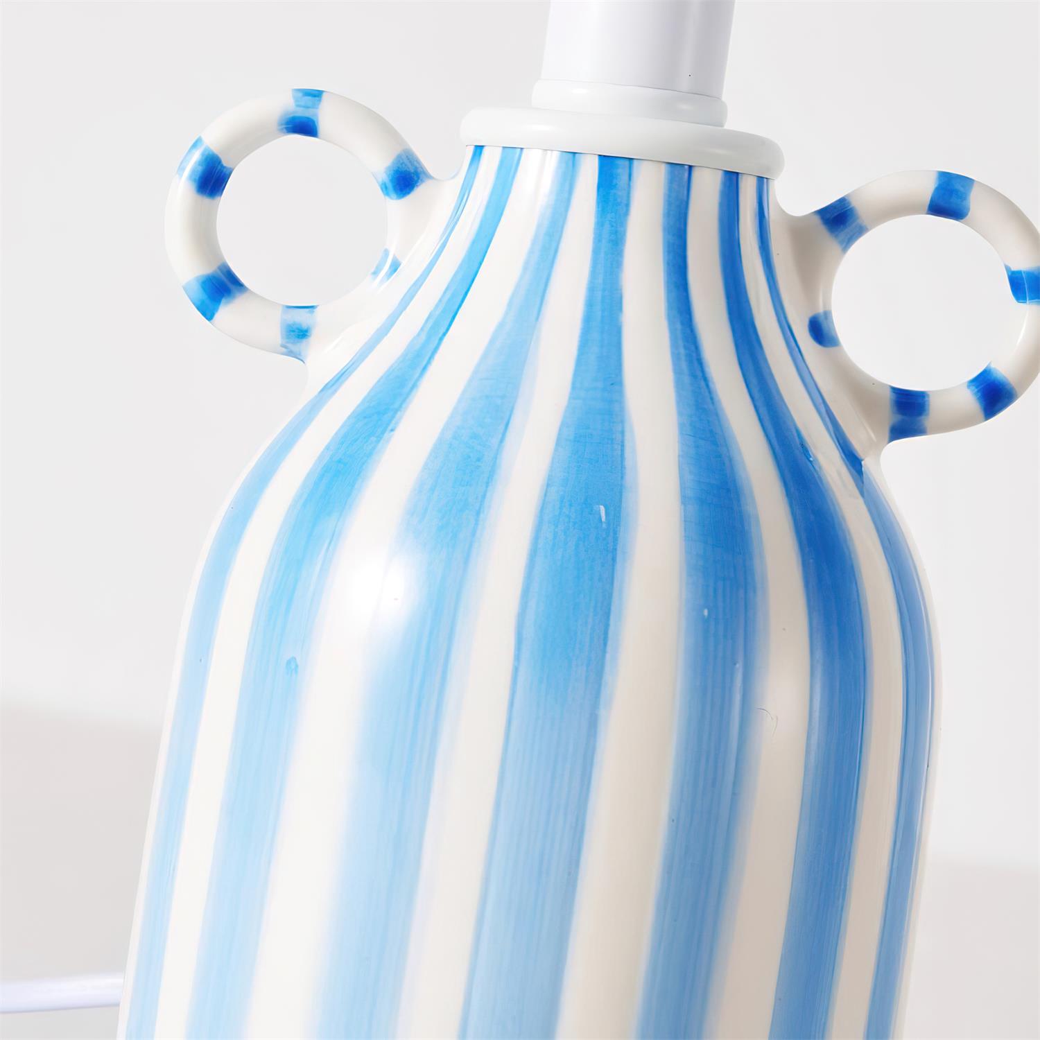 The Blumelo Table Lamp is a visual poem of a coastal summer. Its ceramic base, featuring hand-painted blue and white stripes, evokes the clear skies and gentle waves of the Mediterranean with a playful elegance. The soul of the design is the handcrafted blue felt flower on the lampshade, a whimsical touch that adds unique artistic texture and a sense of warmth.