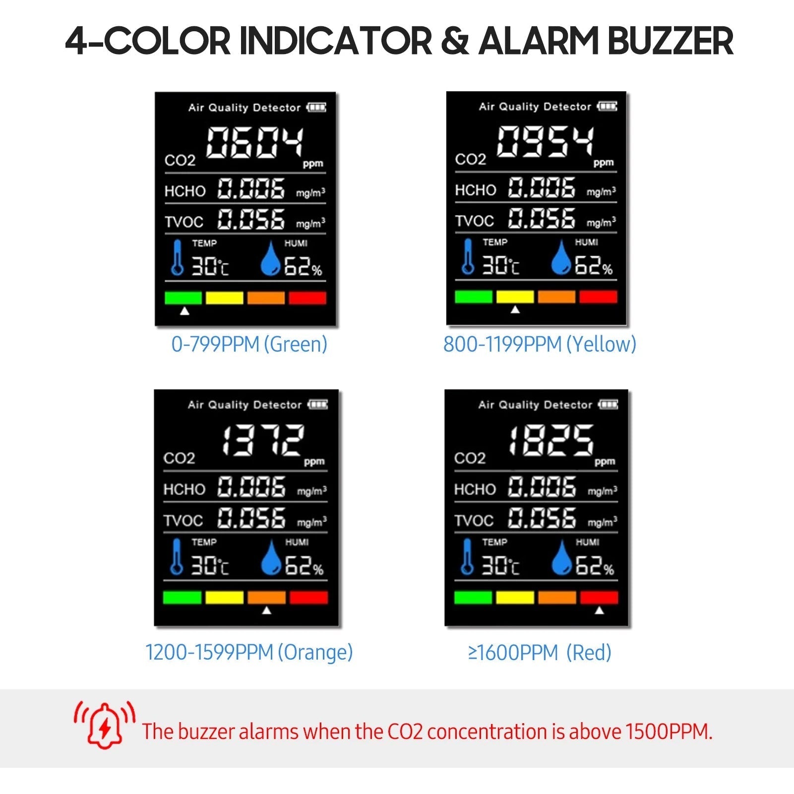 4-Color Indicator & Alarm Sound: 0-799PPM (Green), 800-1199PPM (Yellow), 1200-1599PPM (Orange), 1600PPM and above (Red). An alarm is triggered when CO2 concentration surpasses 1500PPM.