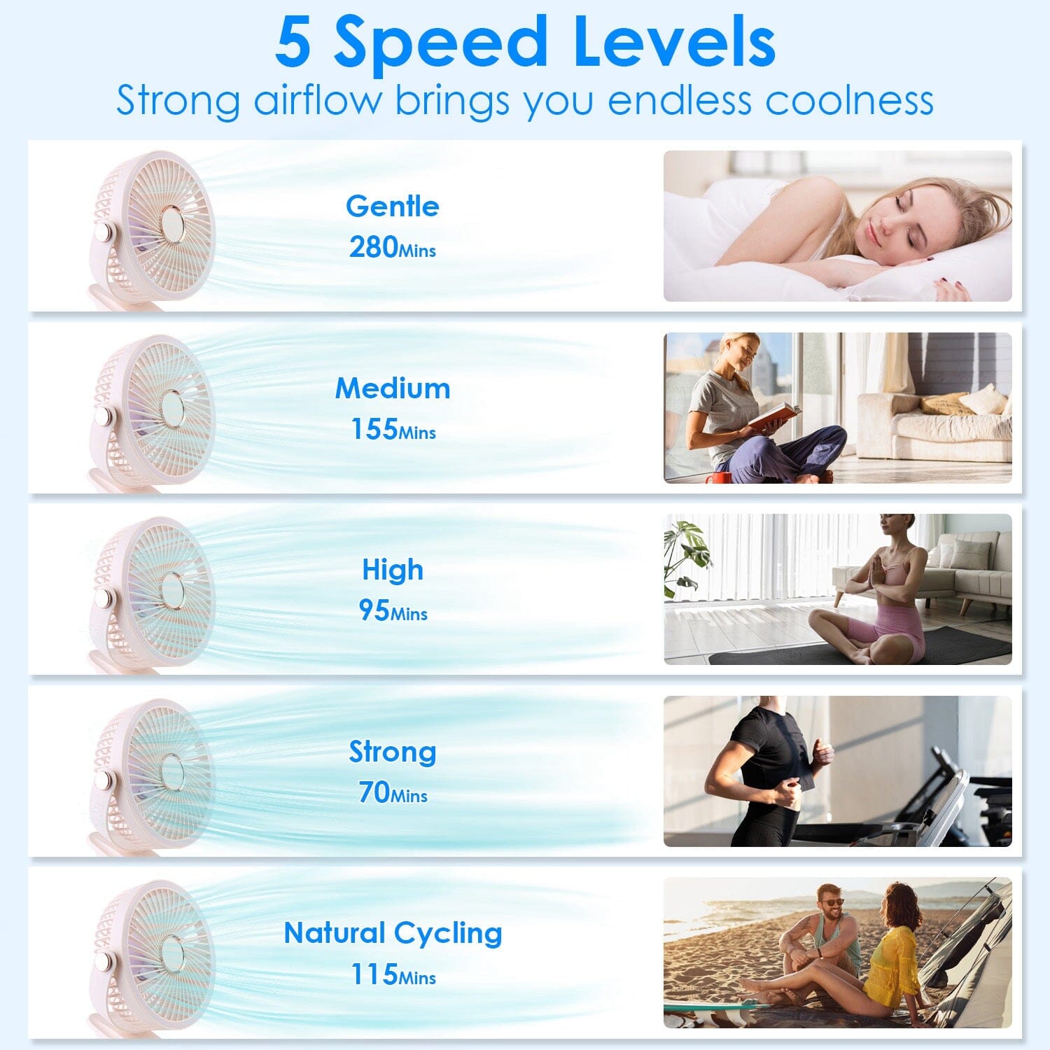 The warm summer days are on the horizon, and a portable, quiet fan is an absolute essential! Our clip fan, featuring a powerful brushless motor, is ideal for desktop usage, wall mounting, and clipping onto various surfaces. With 5 speed settings and 3 brightness levels, our desk clip fan offers endless cooling and lighting options. The 360° oscillation and adjustable angle provide you and your friends with a strong airflow from all directions. Additionally, the Type-C charging cable offers great convenience for recharging. It's the perfect companion for both indoor and outdoor activities like camping, beach trips, office work, driving, and more.