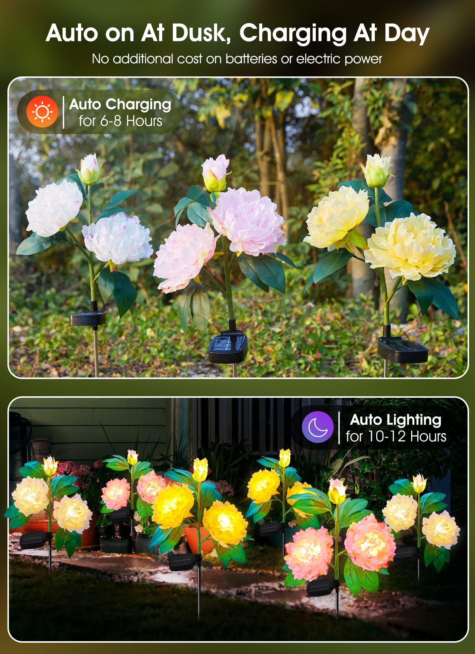 - **Realistic Design**: This pack of 3 solar-powered peony lights comes in beautiful colors (Pink, White, Yellow), creating a magical ambiance both indoors and outdoors. - **Efficient Solar Technology**: Enhanced LED solar lights are equipped with a built-in 1.2V, 600mAh Ni-MH battery, allowing for efficient charging within 6-8 hours and providing 10-12 hours of warm white light. - **Automatic Dusk to Dawn Operation**: These solar lights turn on automatically at twilight and off at dawn, ensuring effortless operation without the need for manual adjustments. - **Energy Efficient & Eco-Friendly**: No electrical connections are needed; simply place them in sunlight and enjoy energy-saving, environmentally friendly lighting. - **Durable & Weather Resistant**: Made from high-quality materials, these IP65 waterproof solar lights are designed to withstand various weather conditions, making them perfect for garden, patio, or pathway decoration. Enhance your outdoor decor with Brightown Solar Peony Lights, perfect for occasions like weddings, birthdays, or simply to beautify your garden. Illuminate your space while enjoying the benefits of sustainable energy. Ideal for creating a romantic atmosphere or simply adding charm to any setting, these lights are a wonderful addition to your home or garden.