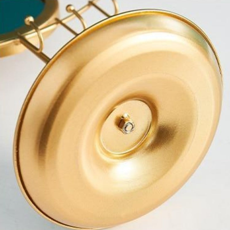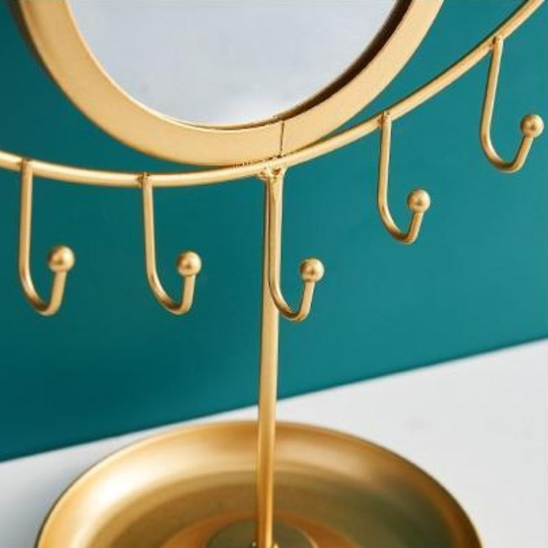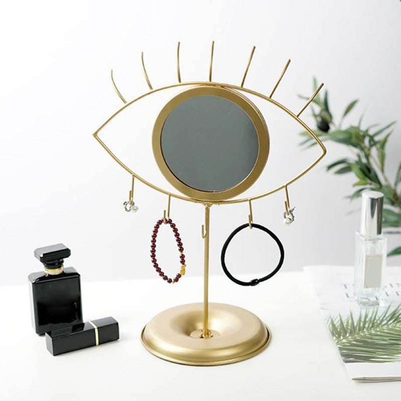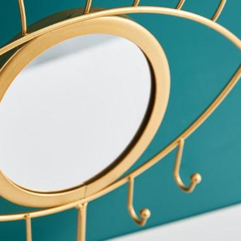 Complete your vanity with a protective talisman in the form of this extraordinary, functional standing mirror that also has a mystical touch. Five hooks allow for hanging necklaces, earrings, and bracelets, while a round mirror sits proudly in a golden, eye-shaped frame, surrounded by an elegantly curved bowl, perfect for holding rings, jewelry, and other valuables. The Evil Eye makeup mirror promotes positive karma while ensuring organization, making quick checks of hair and makeup easy.