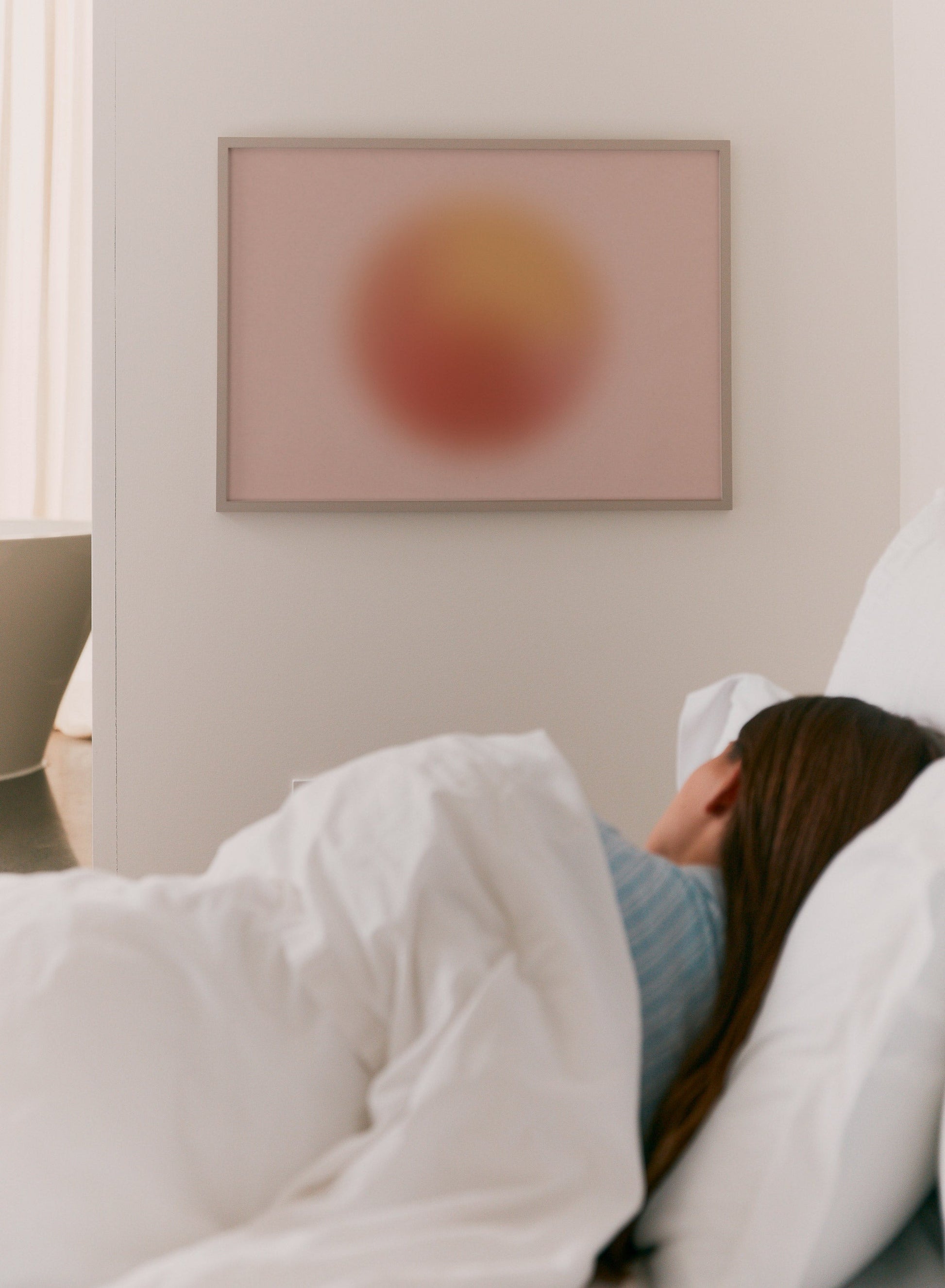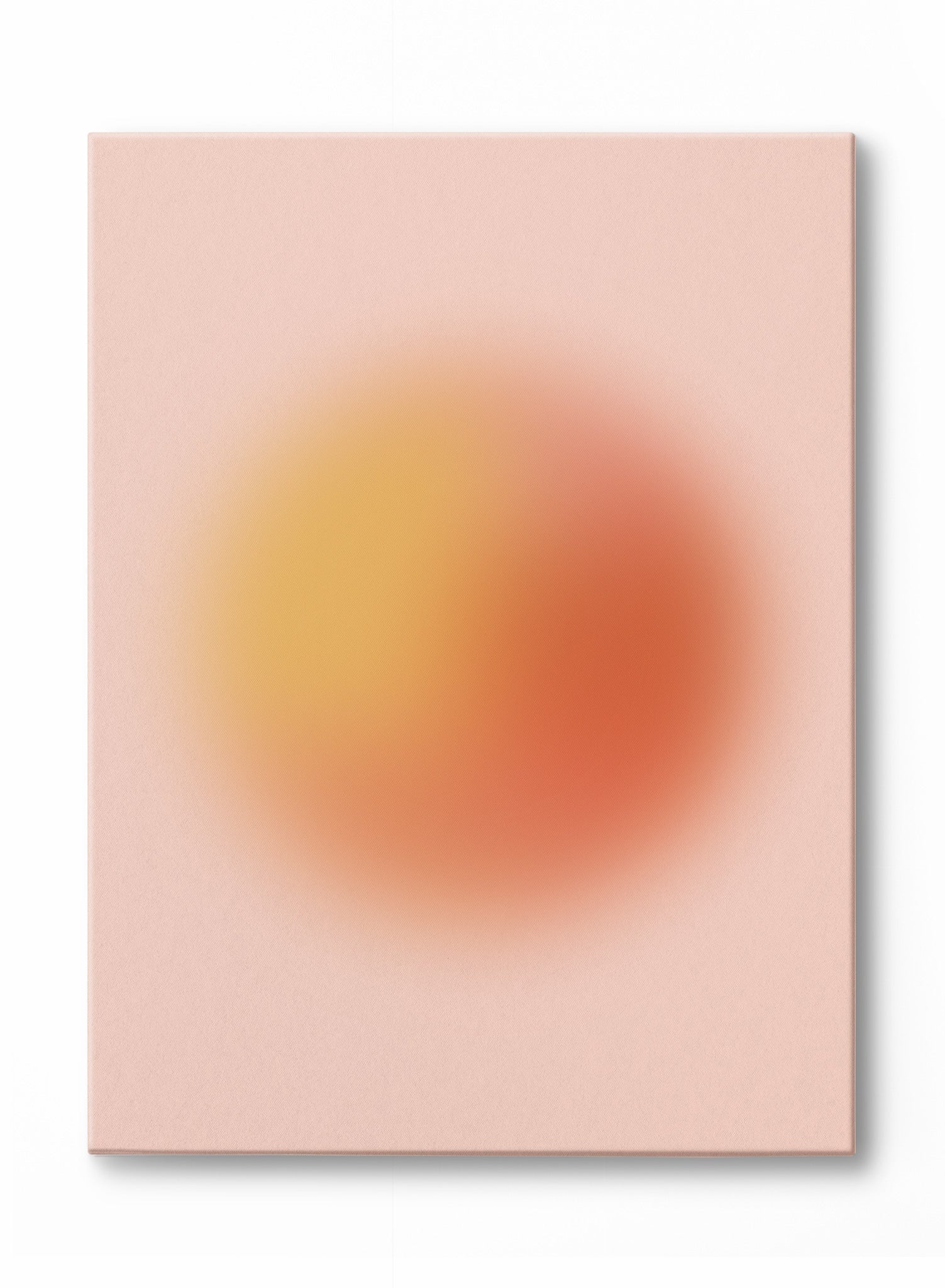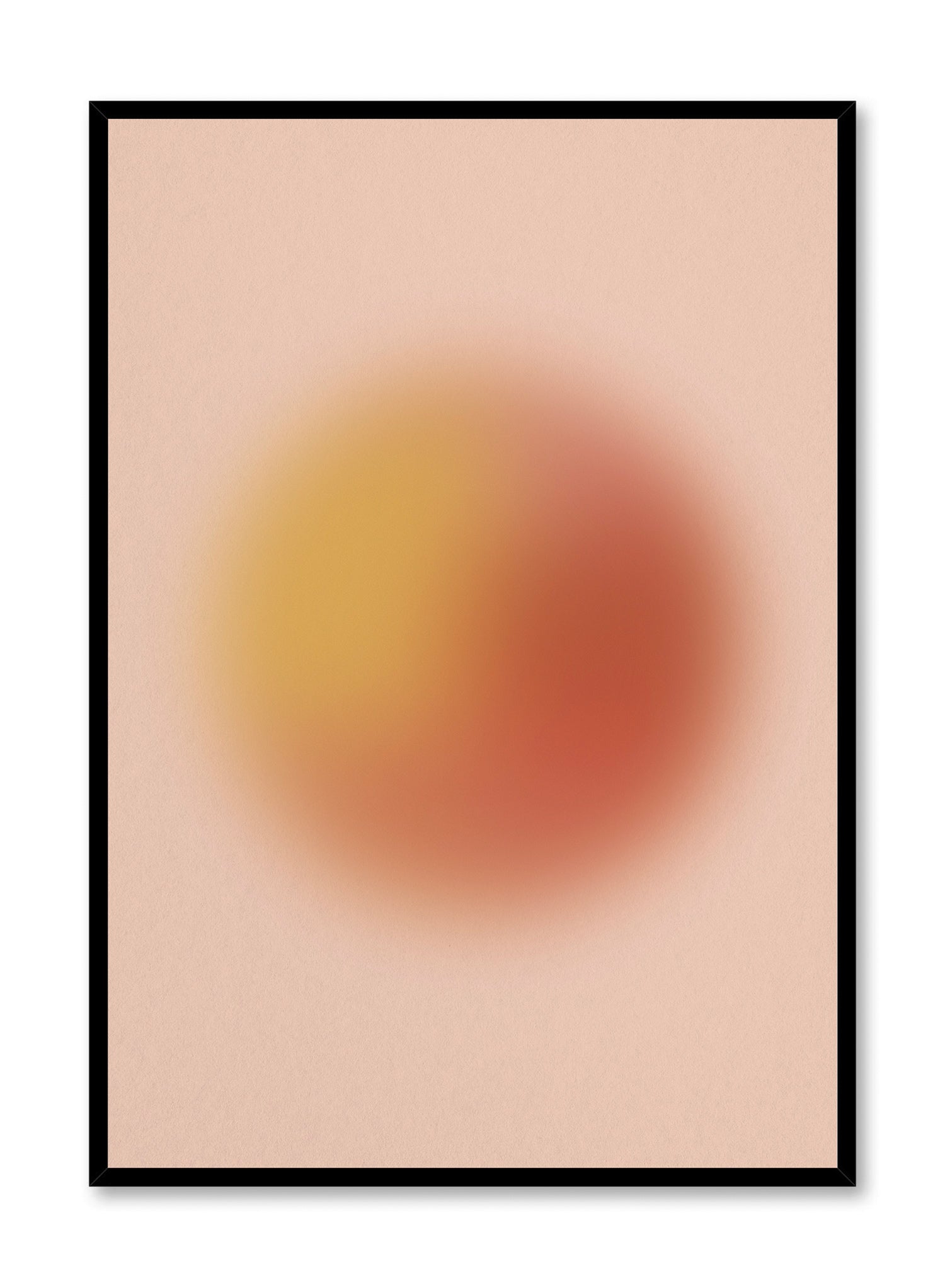 Refresh your decor with "Bubbly in Blush": a vibrant, abstract print featuring a striking, blurred orange sphere floating above a soft pink background.