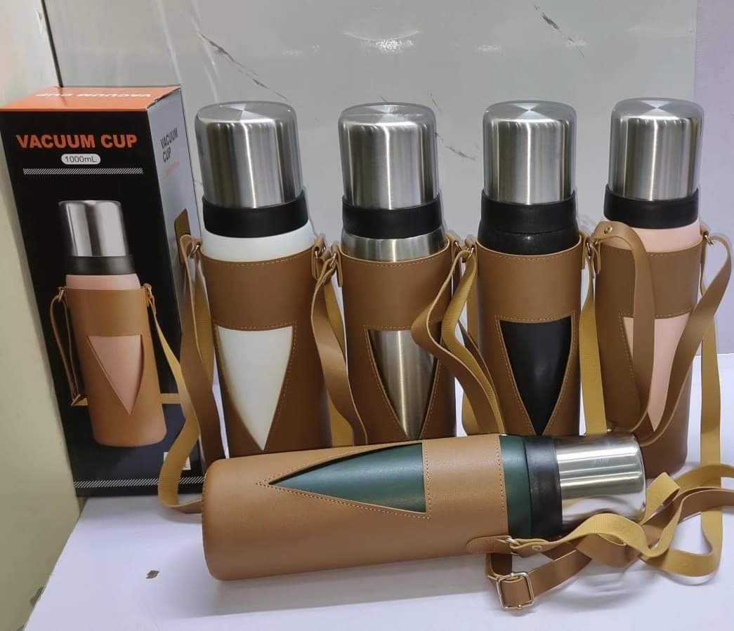 Outdoor travel mug available in 1000ml and 1200ml capacities, complete with a convenient leather carrying case.