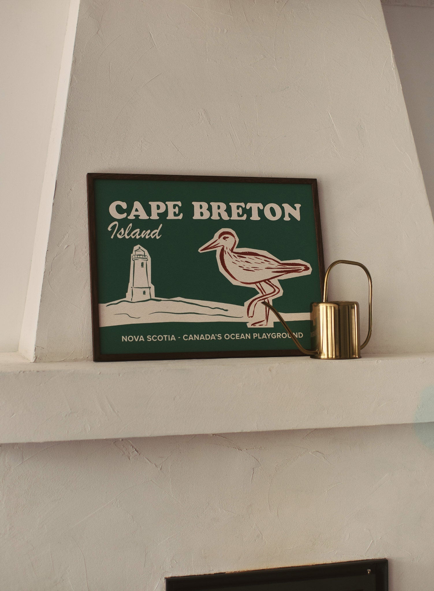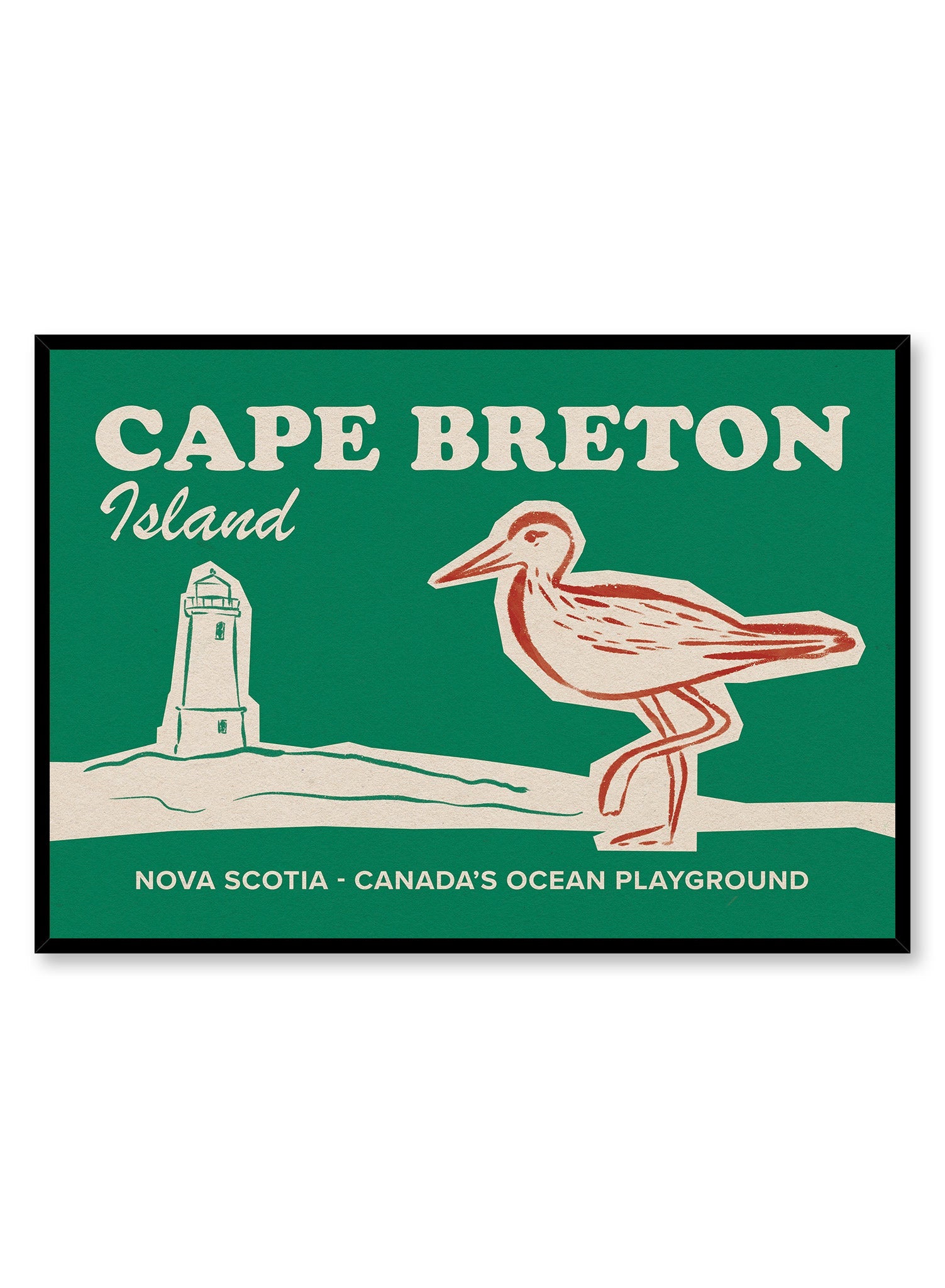 Next Stop: Cape Breton Island! This green poster celebrates the most breathtaking coastal region of Nova Scotia with a nostalgic font and an illustration of a Sandpiper.
