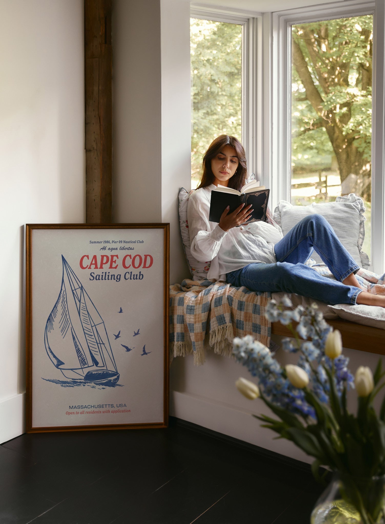 Let the sails dance for a captivating interior with this vintage poster from the Cape Cod Sailing Club, showcasing a blue sailing yacht adorned with blue and red lettering.