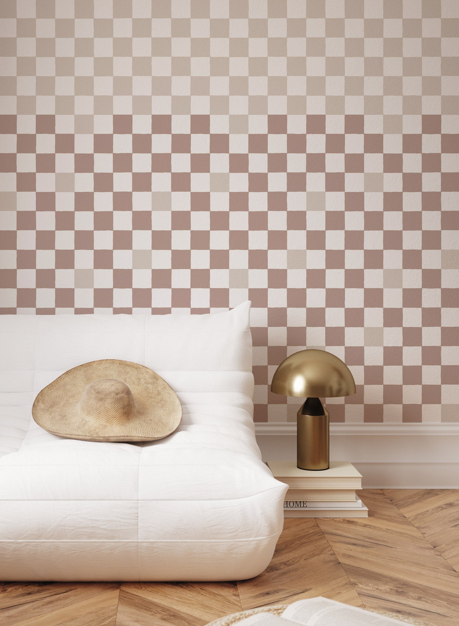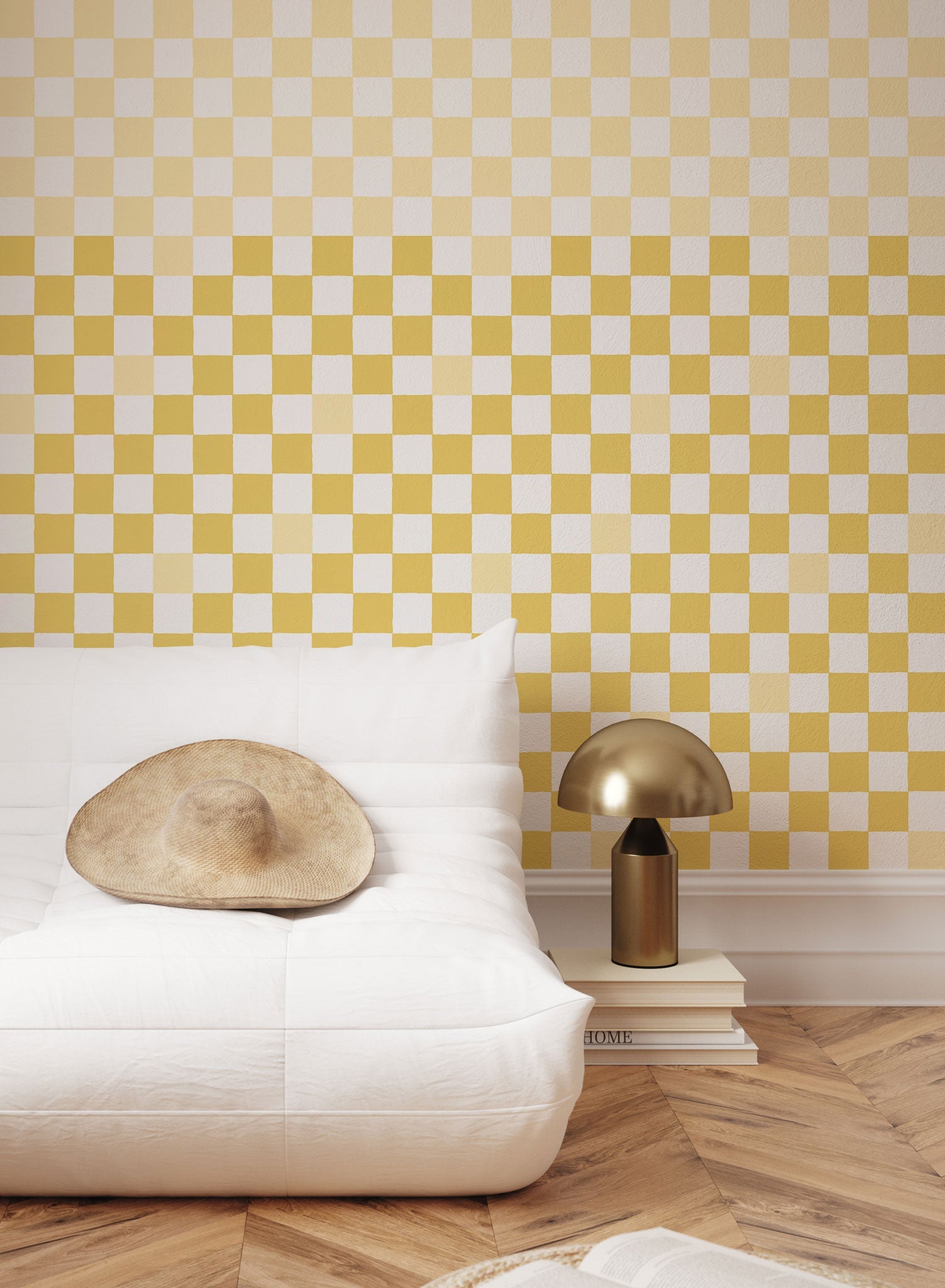 Introducing the ladies' design with a unique touch! The Checkmate wallpaper features a stylish checkerboard pattern with colorful squares alternating with white fields. The gradient of the pattern flows downward, adding a playful vibe. Checkmate wallpaper comes in various options: Blue, Green, Yellow, and Red. As always, it is available in both peel-and-stick vinyl form and in a matte pre-pasted wallpaper format.