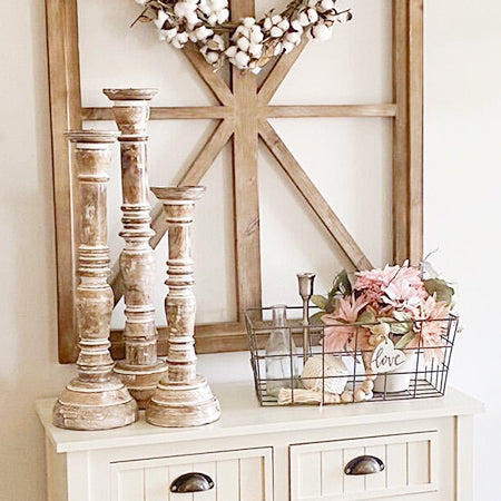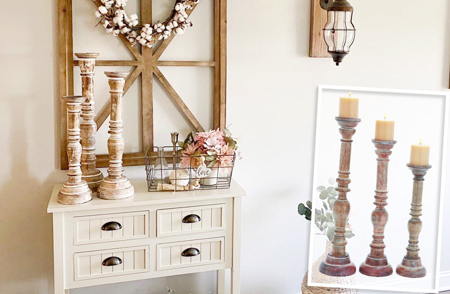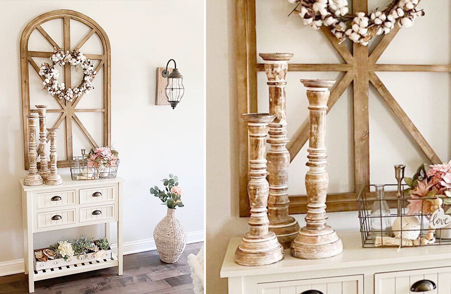 When we first saw these carved wooden candle holders, we couldn't stop thinking about all the possibilities for decoration! Place these carved wooden candle holders on your mantel and create a soft glow, highlight your console table, or create a centerpiece on your dining table where these pillars take center stage!! You can even swap out the candles depending on the season, holidays, or special occasions and instantly create a whole new style!