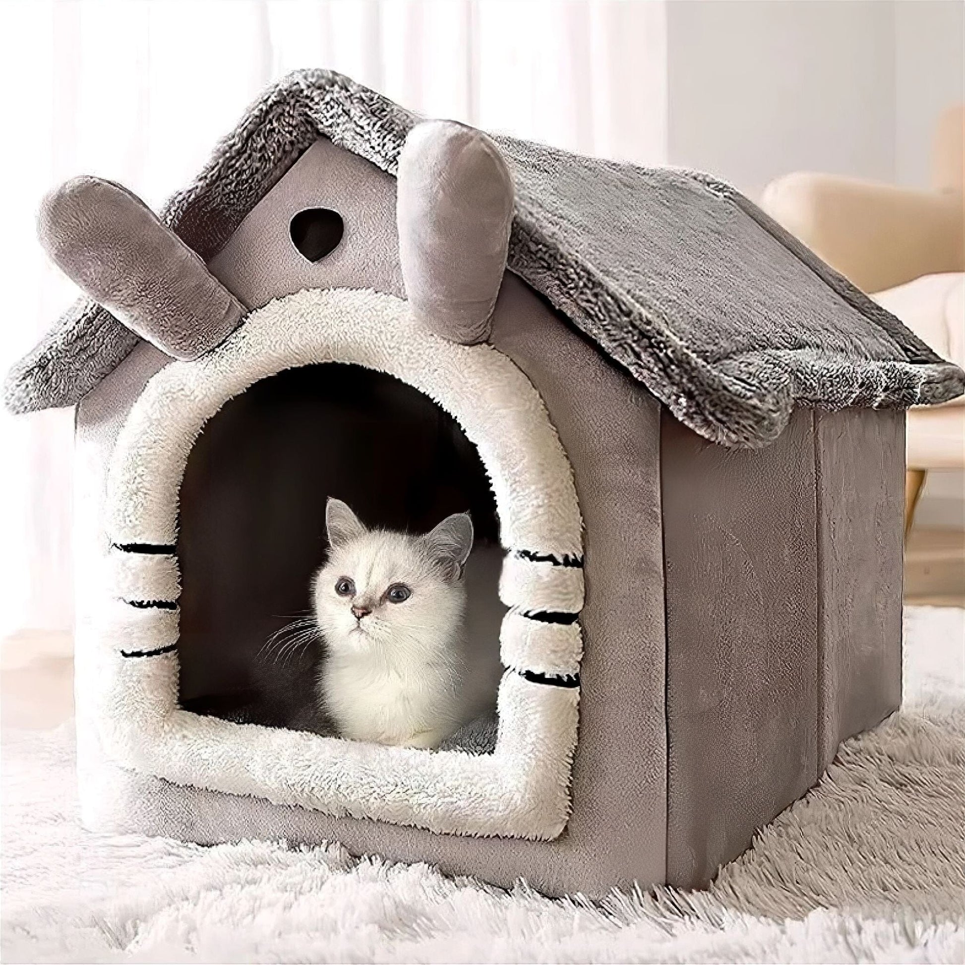 The cozy pet tent serves as an ideal refuge for animals of all sizes. Constructed from durable velvet, it features elastic foam that guarantees maximum comfort. Thanks to its straightforward setup, removable zip cover, and portable design, it is suitable for both home use and travel. Additionally, the reversible cushion ensures that your pet stays warm during winter and cool in summer, providing a comfortable space for them throughout the year!