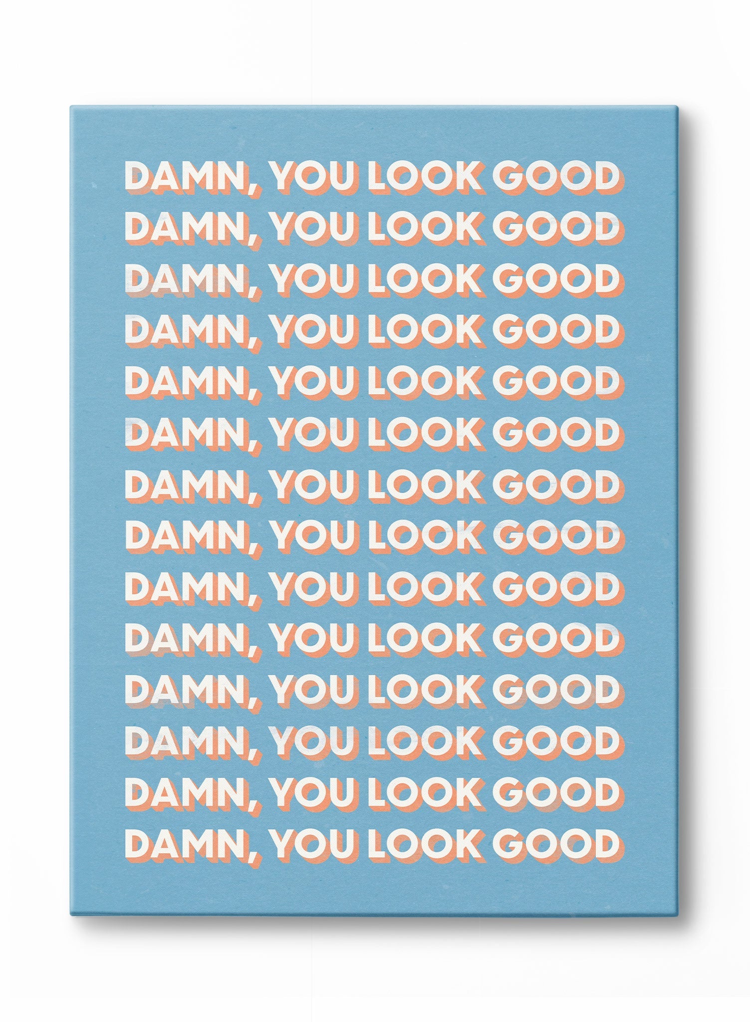 Here’s your daily reminder that... "Wow, you look amazing!" This playful typography poster showcases a continuous uplifting message in white block letters with pink shadows set against a blue background.