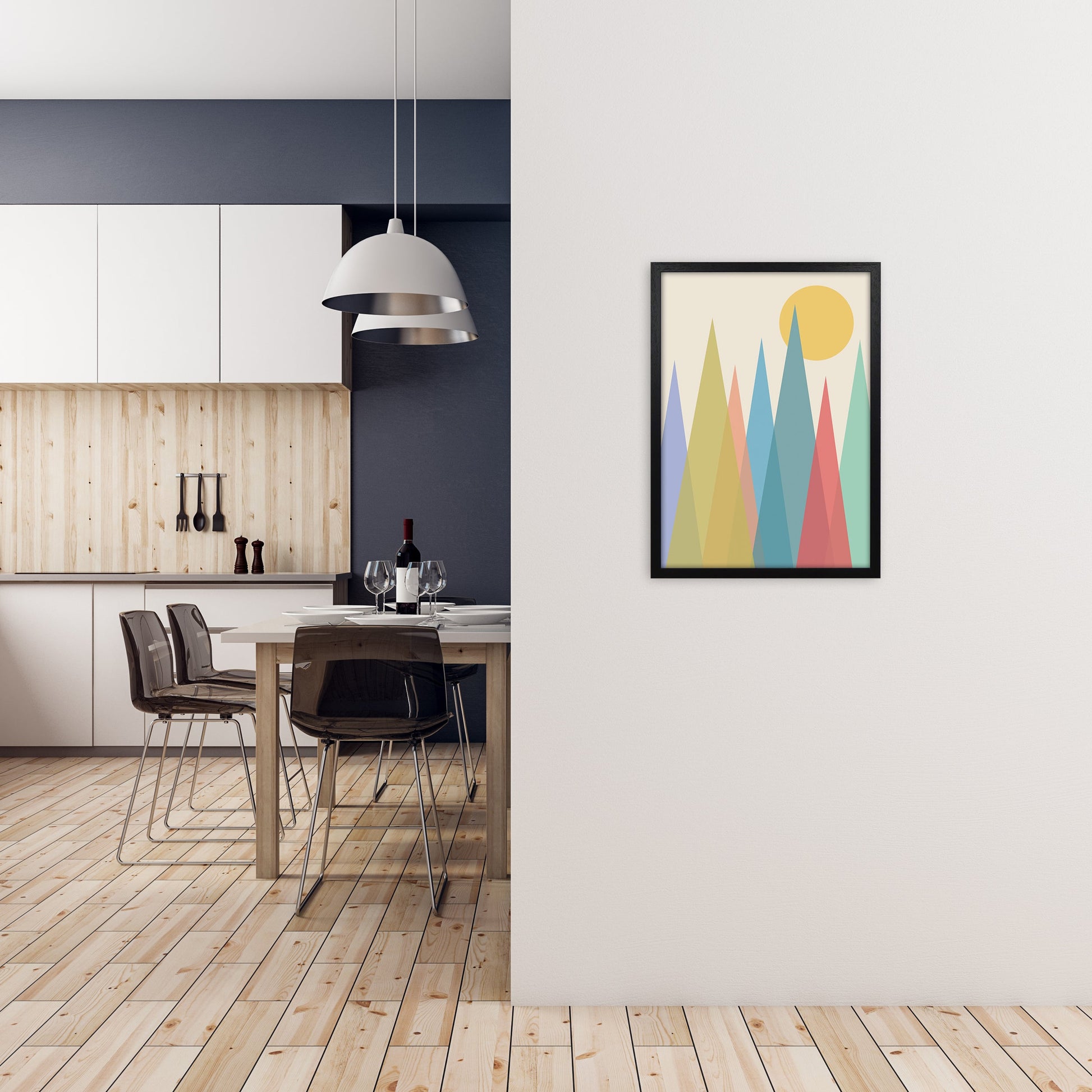 Most customers opt to have their print framed by our in-house team who handcraft all our frames to order. Options such as black, white, or honey oak are available from sustainable sources. Our framed artworks are glazed with crystal styrene for safety during shipping and at home, ensuring long-lasting durability. Frames come ready to hang on the wall.