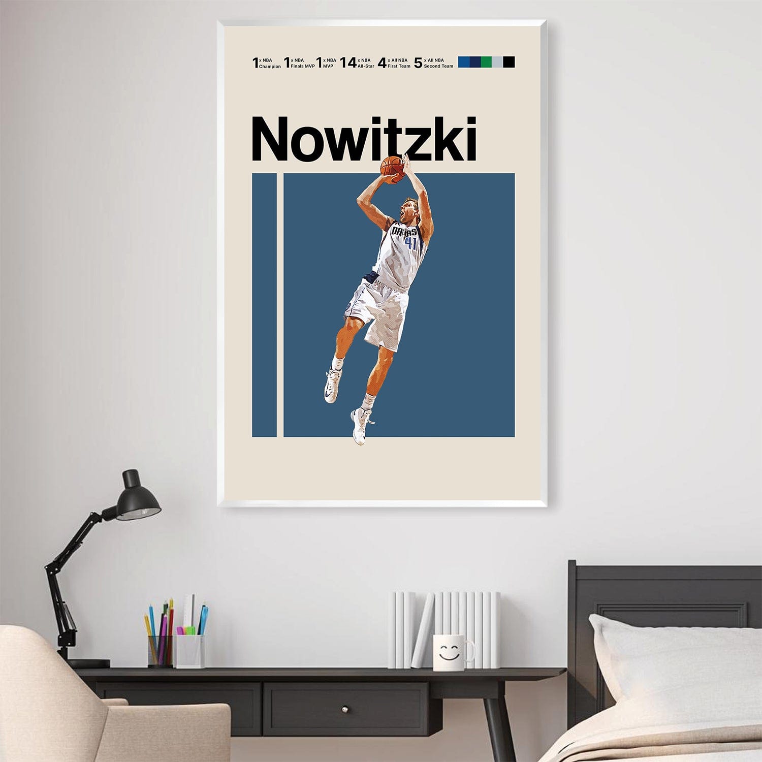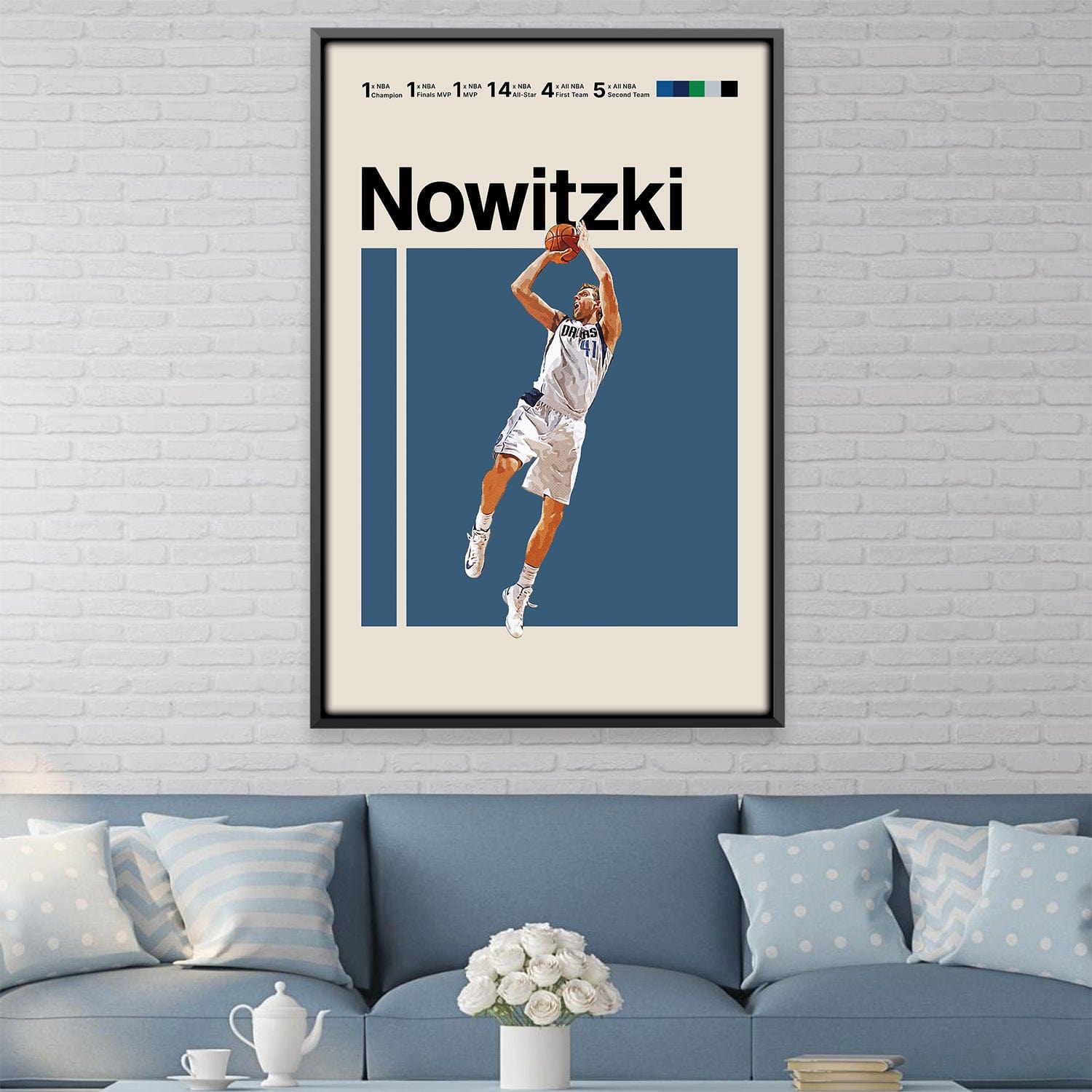 Enhance any bare wall in your home with a touch of elegance and glamour by incorporating this striking print. This canvas features a vivid portrayal of Nowitzki as he blurs during his shooting motion.
