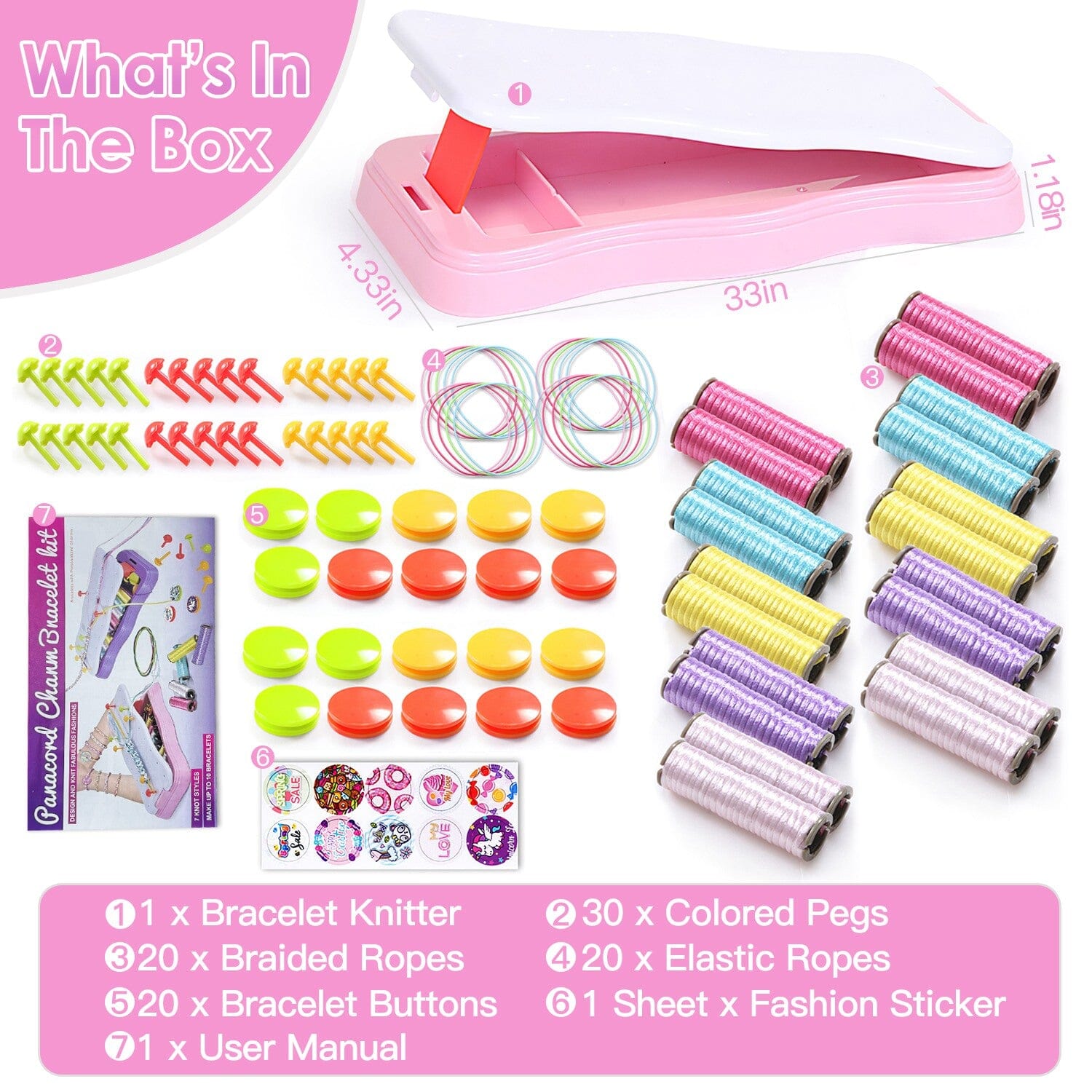 - Complete Girls Craft Set: This fun DIY craft set comes with 1 bracelet maker, 30 colorful pegs, 20 braided cords, 20 elastic cords, 20 bracelet buttons, 1 sheet of fashion stickers, and 1 easy-to-follow instruction manual.