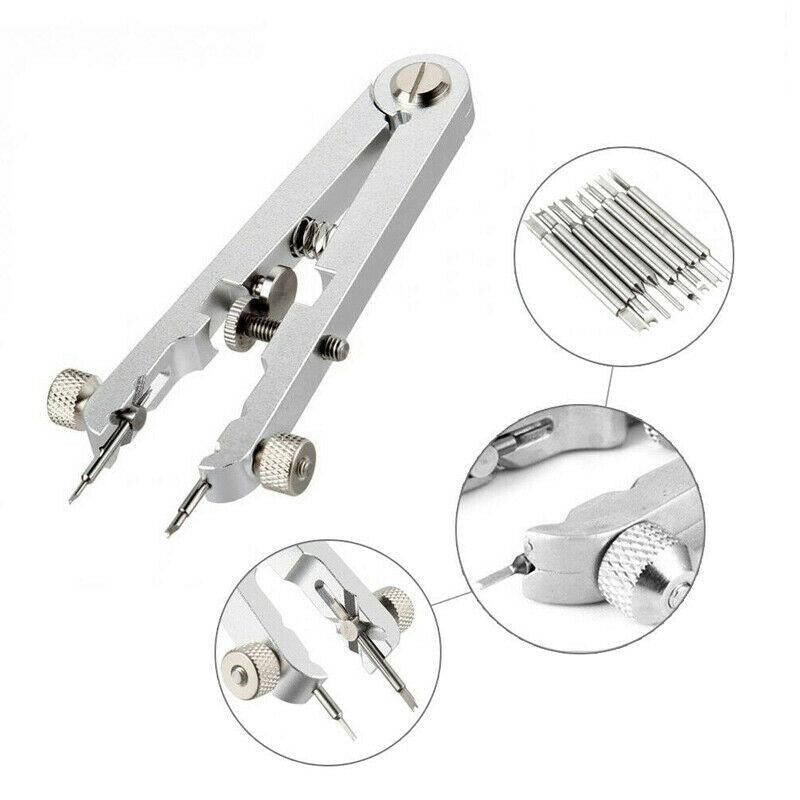 The tool incorporates an adjustable spring mechanism to ensure compatibility with most watch sizes. It can be fine-tuned for spring bar widths ranging from 5 mm to 30 mm. An excellent, versatile repair tool for DIY watch enthusiasts! -