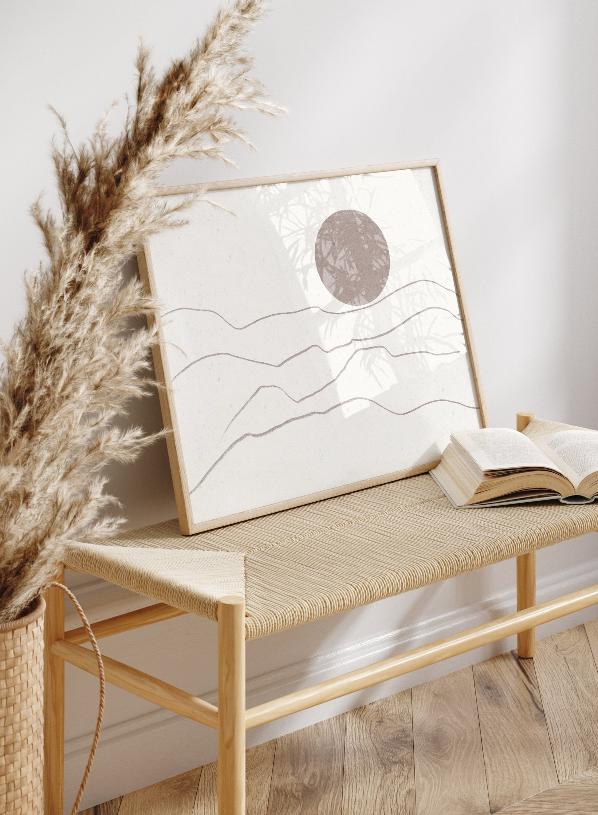 This abstract depiction of a sunset over mountains is sure to captivate the hearts of Boho decor enthusiasts. The 'Dune' poster features irregular, minimalist, reddish-brown lines arranged beneath a textured circle symbolizing a sunset. We are thrilled with this horizontal landscape print and its soothing two-tone palette of gentle beige and soft pink. If you appreciate abstract Boho art, we are confident that this piece will delight you as well!