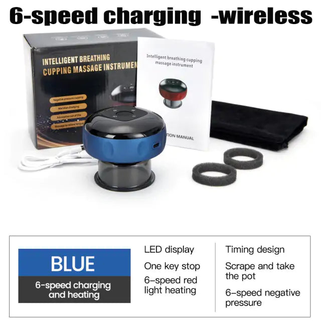 - Type B: Breath pressure, 6-speed red light heating, 6-speed negative pressure, LED display, one-button suction stop, timed design, scraping and cupping massage 3 in 1 (USB charge)