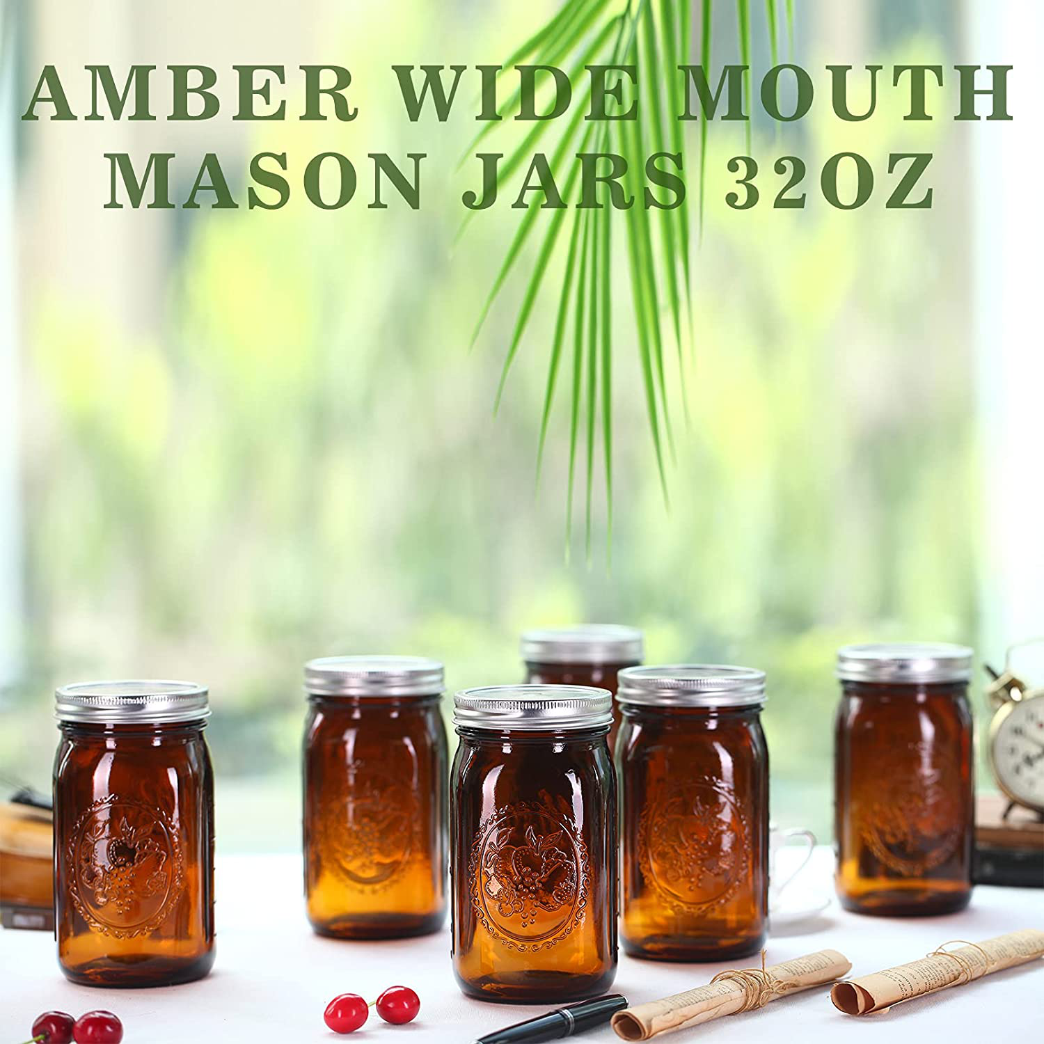 - HIGH QUALITY: 6 pieces of 32 oz Amber Wide Mouth Mason jars made from amber glass that blocks 99% of harmful UV rays, helping to preserve the flavor, aroma, and nutrients of food, herbs, and spices with the use of airtight lids. Secure lids ensure freshness, with high-quality glass and leak-proof silver metal covers that are airtight.