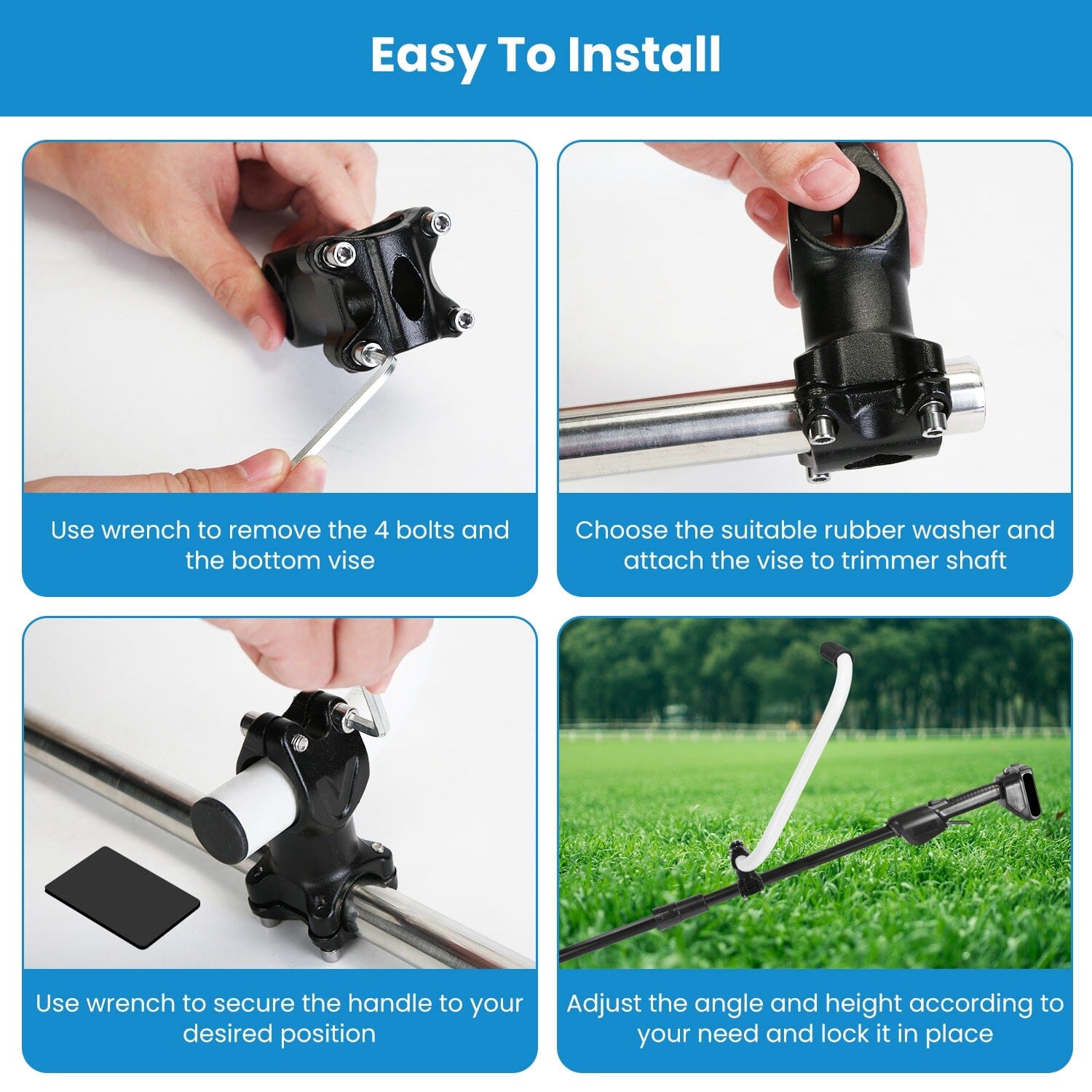 - Easy to Install: Simply loosen the four bolts, attach the clamp to the trimmer pole, adjust it to your desired position, use the wrench for angle or height adjustments of the integrated clamp, and secure it in place as needed.